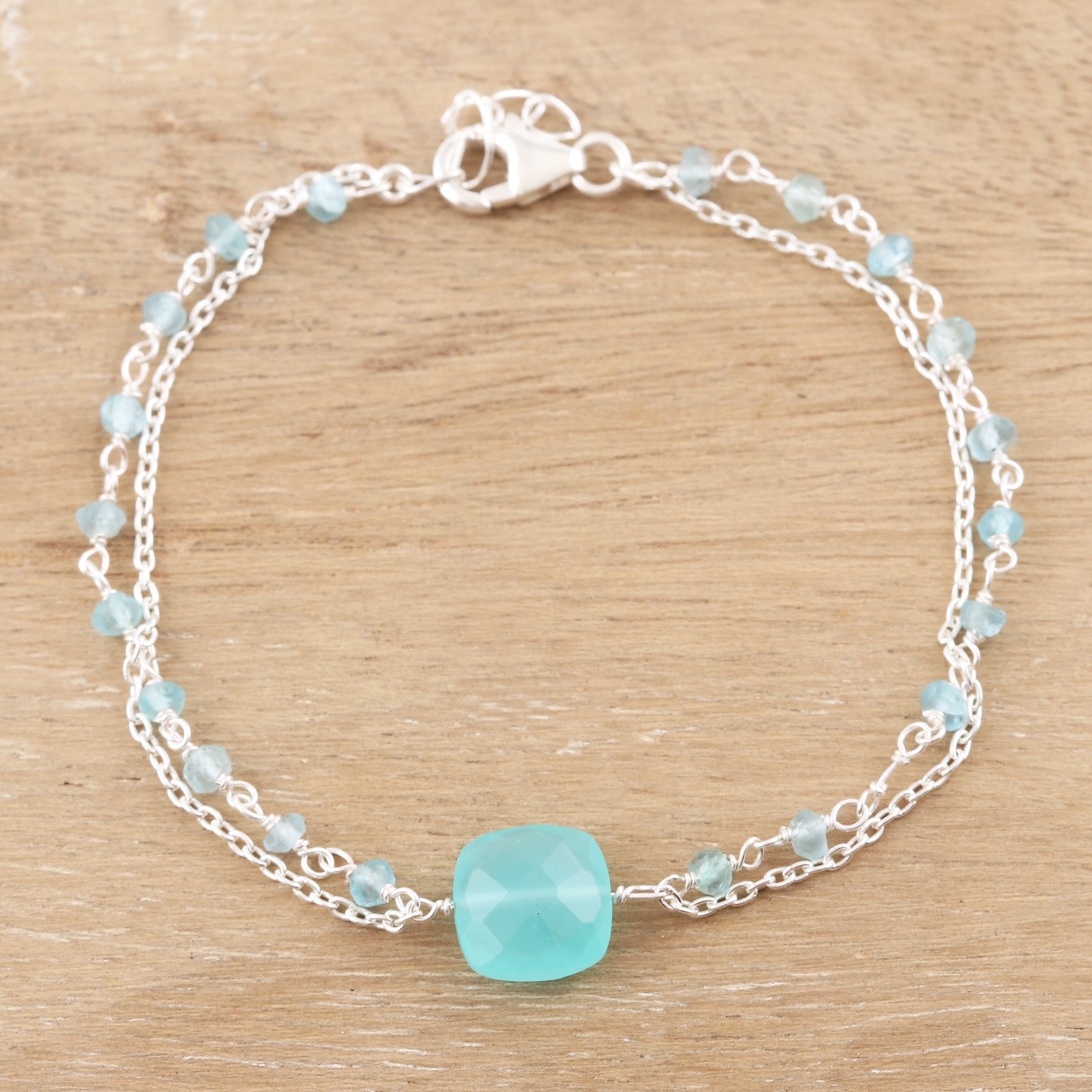 Cool silver and aqua-colored gems mingle in Neetu Barathi's frosty bracelet. The Indian artisan centers the bracelet with a checkerboard chalcedony gem, while a sterling silver cable chain fastens with a lobster claw clasp. A second chain made of chalcedony beads and sterling silver link gives the bracelet an extra special touch.