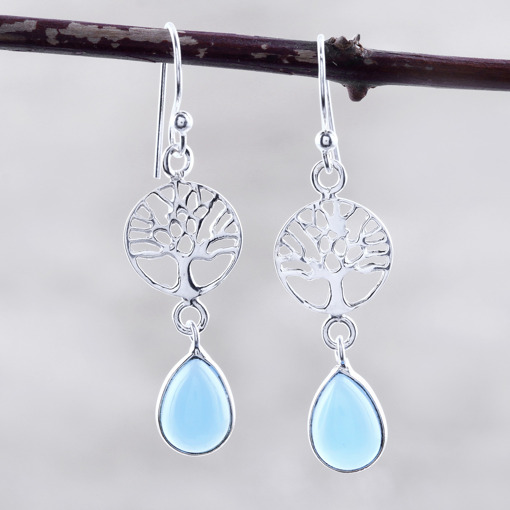Cool silver and aqua-colored gems glow on Neetu Barathi's elegant dangle earrings. The artisan suspends smooth chalcedony gemstones from an openwork tree motif in polished sterling silver, while sterling silver hooks finish the pretty pair.