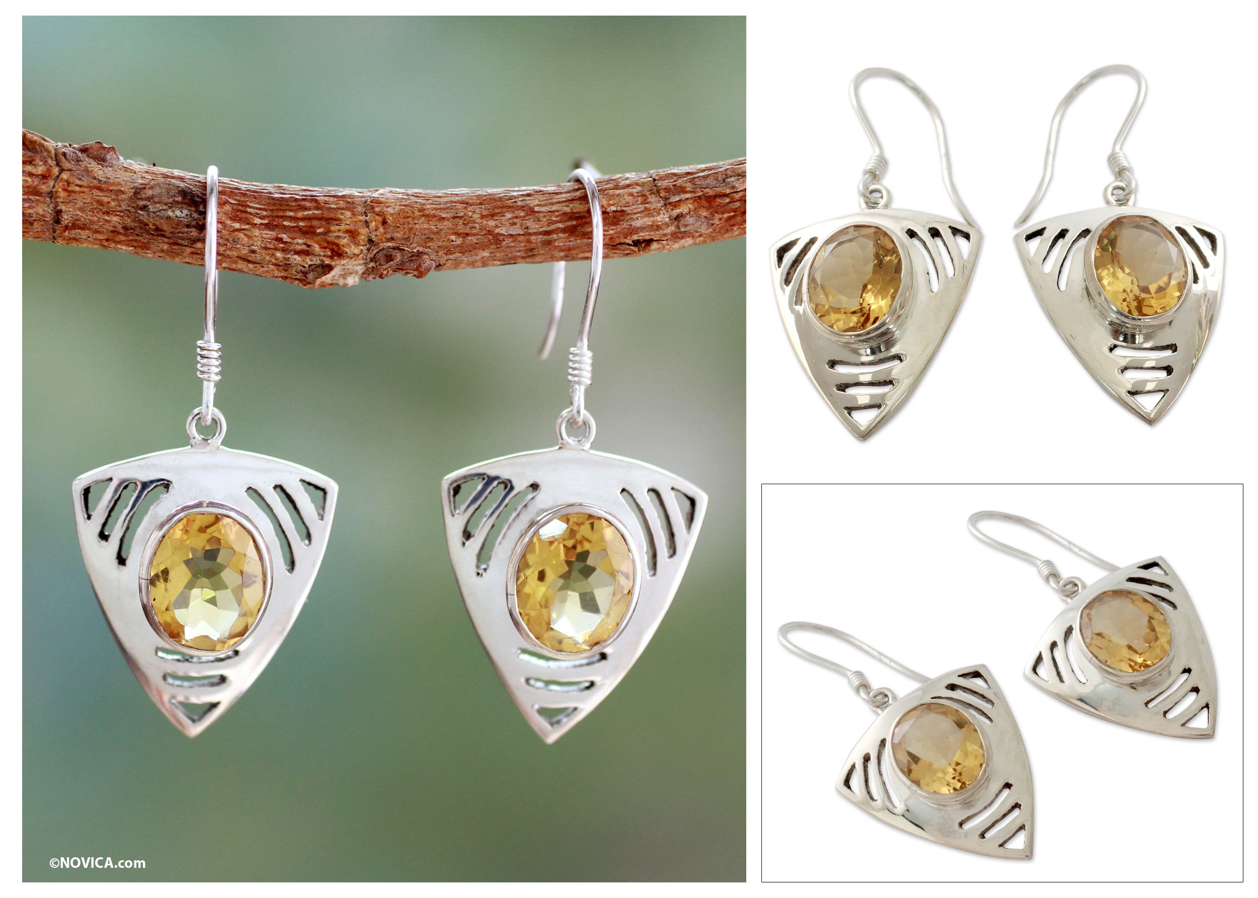 Combining modern styling with tradition, Shubhra Singh creates these beautiful earrings. A sparking citrine centers sterling shields with discreet jali, or openwork motifs.