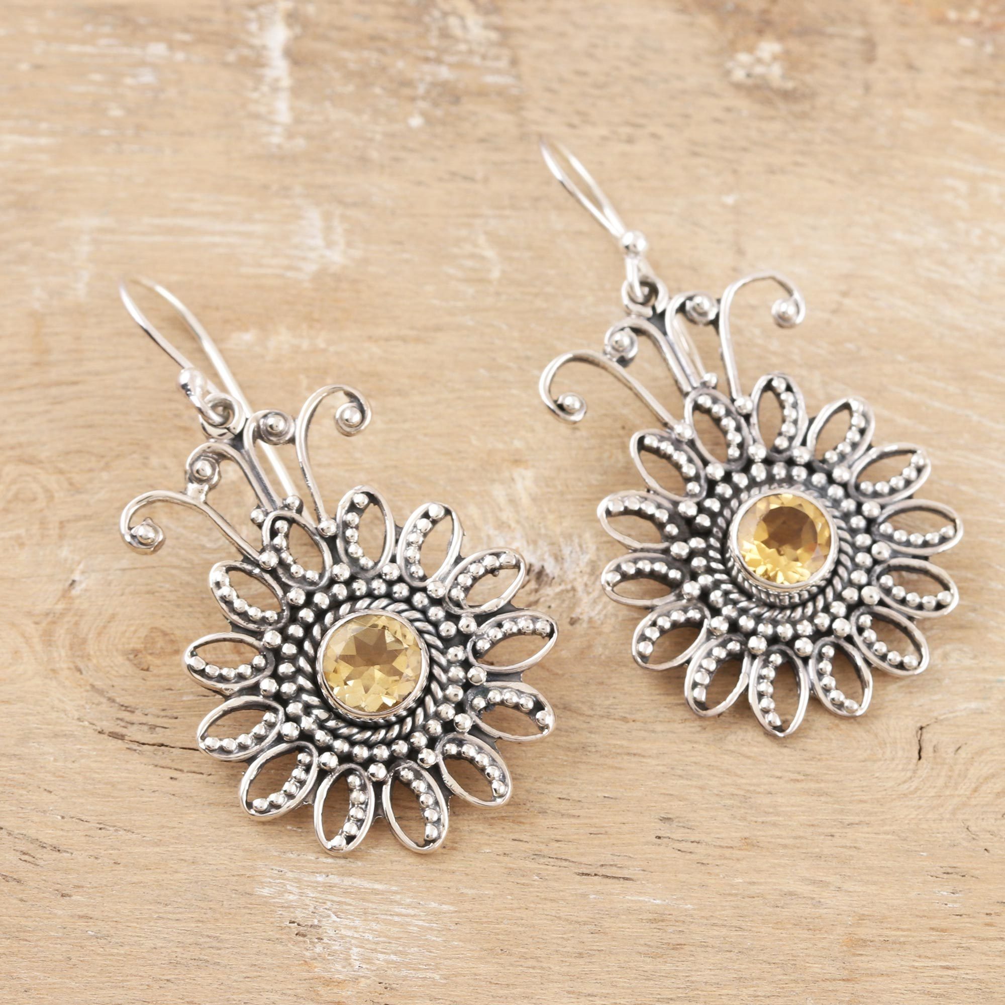 Bring light and cheer into your life with Neeru Goel pretty floral earrings. Indian artisans center the delicate earrings with sunny citrine gems, accenting the stones with sterling silver petals which swing from shining sterling silver hooks.