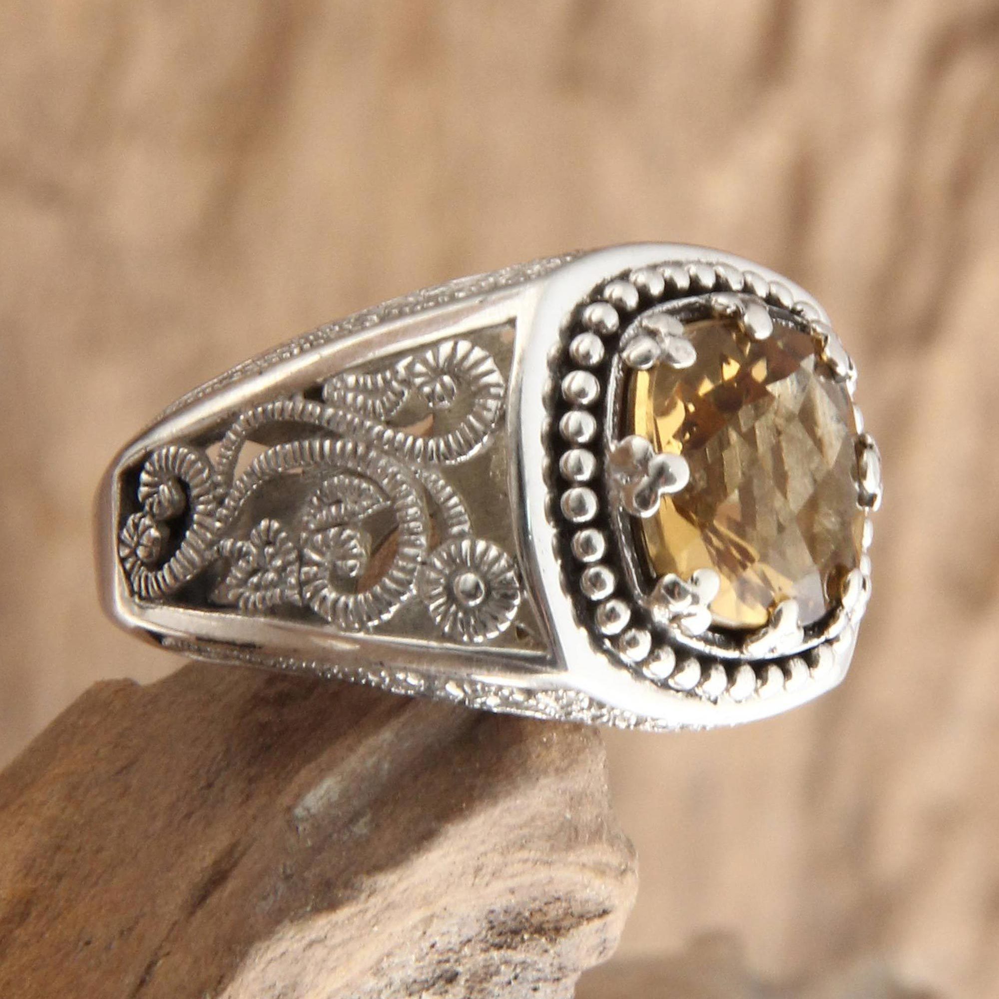 Sunflowers turn their faces to the light in the dazzling silver setting of this opulent ring crowned with a 3.5 carat golden citrine. By Kadek Hendra from Indonesia, this richly detailed ring is made by hand to recall the beauty of a Balinese garden opening beneath a tropical sun. This splendid jewel, featuring November's birthstone, is like a lovely gleam of sunshine for your hand.