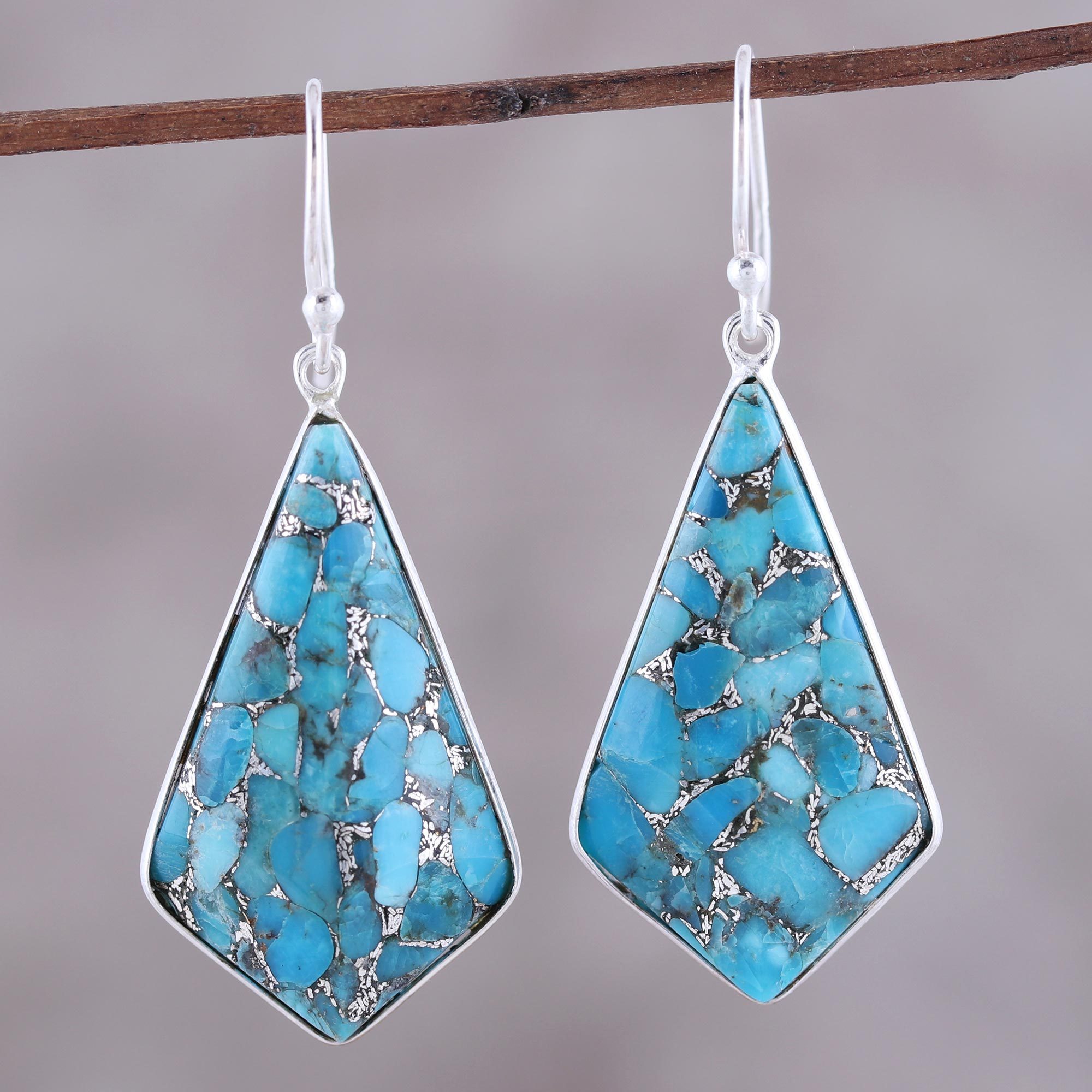 Resembling a pair of kites, these Indian dangle earrings reflect the beauty of the sky. Sterling silver frames beautiful composite turquoise with silver veins in this accessory designed by Neetu Barathi.