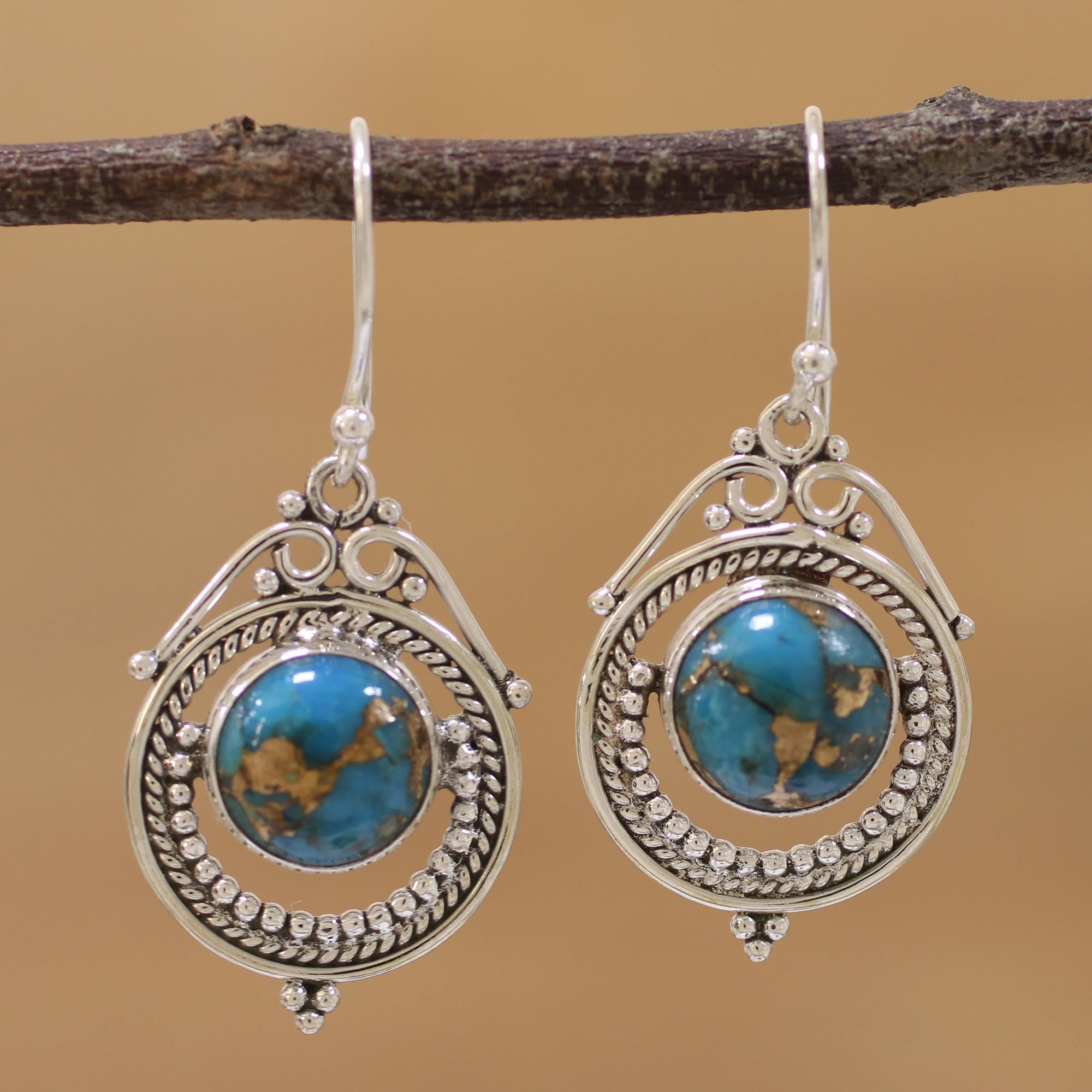 Gleaming with hues of gold and blue, composite turquoise forms elegant globes that center these dangle earrings from India. Designed by local artisans, each earring is crafted of sterling silver with a combination of finishes that accentuates the bubble and rope motifs. Alok Jain presents this captivating accessory.