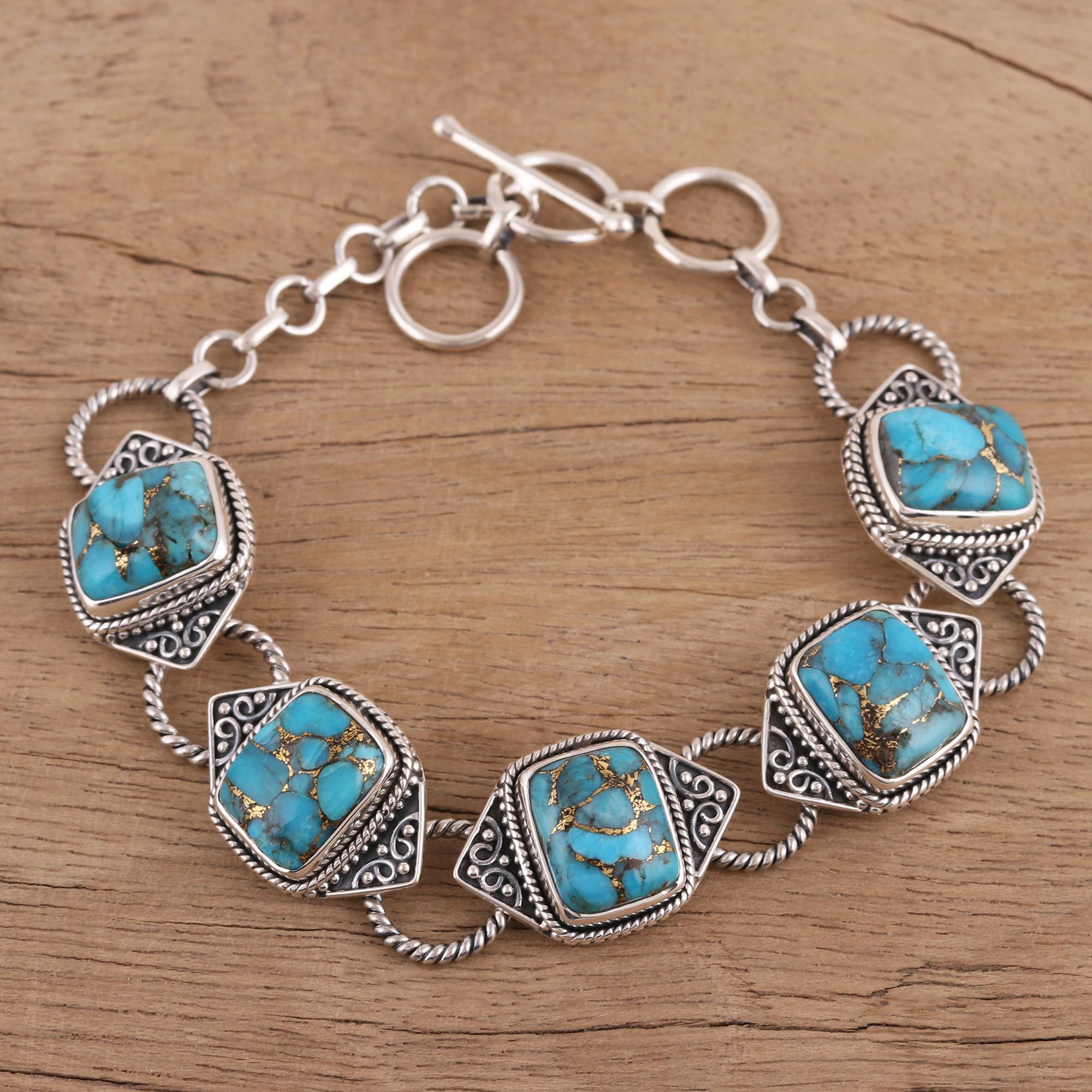 Artisan Neeru Goel of India designs this exquisite link bracelet. Five composite turquoise stones with a brilliant hue rest in bezels made from sterling silver and adorned with rope and swirl motifs.