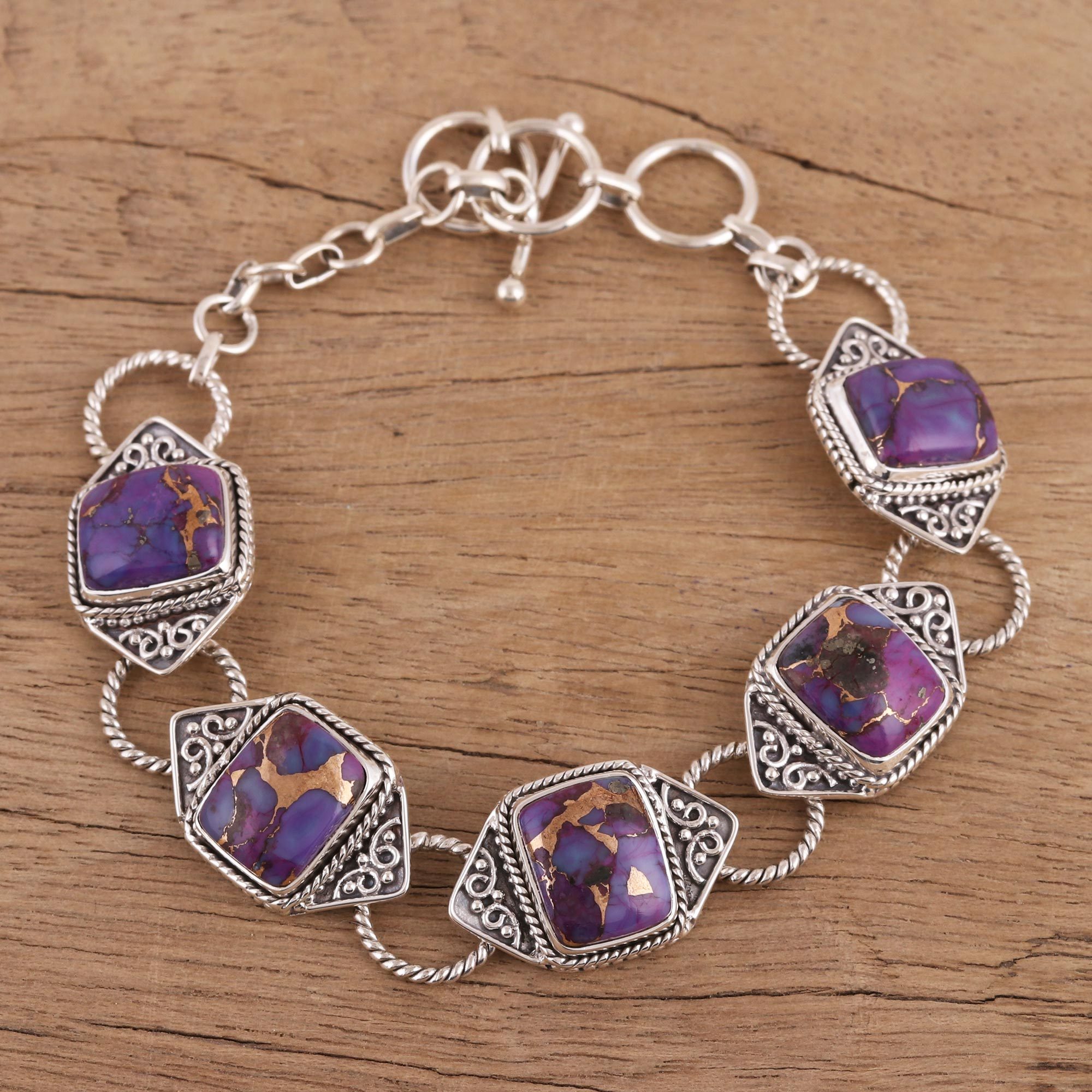 Artisan Neeru Goel of India designs this exquisite link bracelet. Five composite turquoise stones in a brilliant shade of purple rest in bezels made from sterling silver and adorned with rope and swirl motifs.