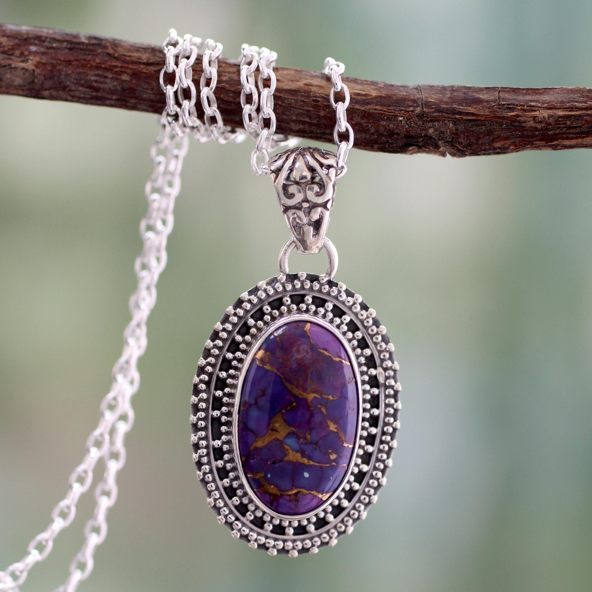 Set with glowing purple composite turquoise, an oval pendant encloses a mysterious beauty. Alok Jain presents an enchanting necklace that surrounds the gem in sterling silver.