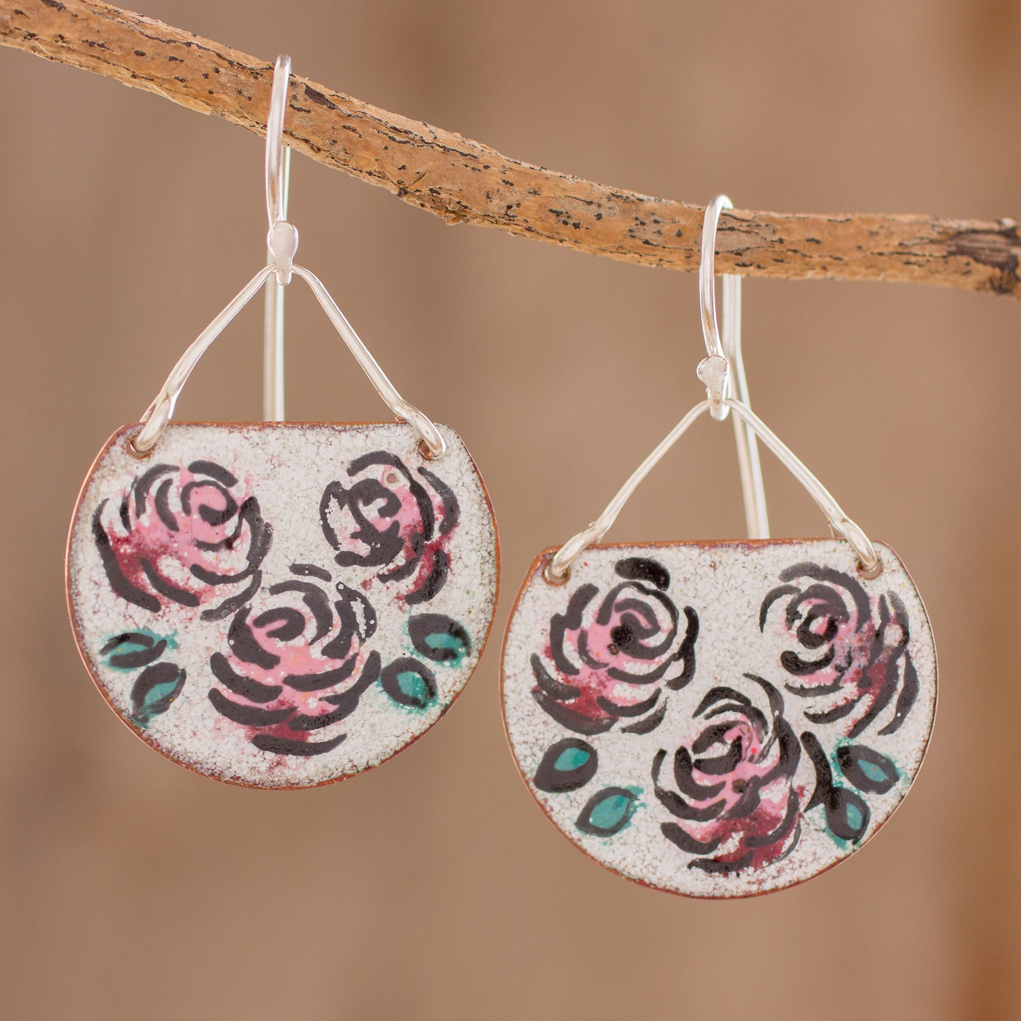 Hand-painted with floral motifs, these vintage-style dangle earrings are designed and crafted by Guisselle Mora. The Costa Rican artisan crafts the earrings of copper, dangling from sterling silver wire.