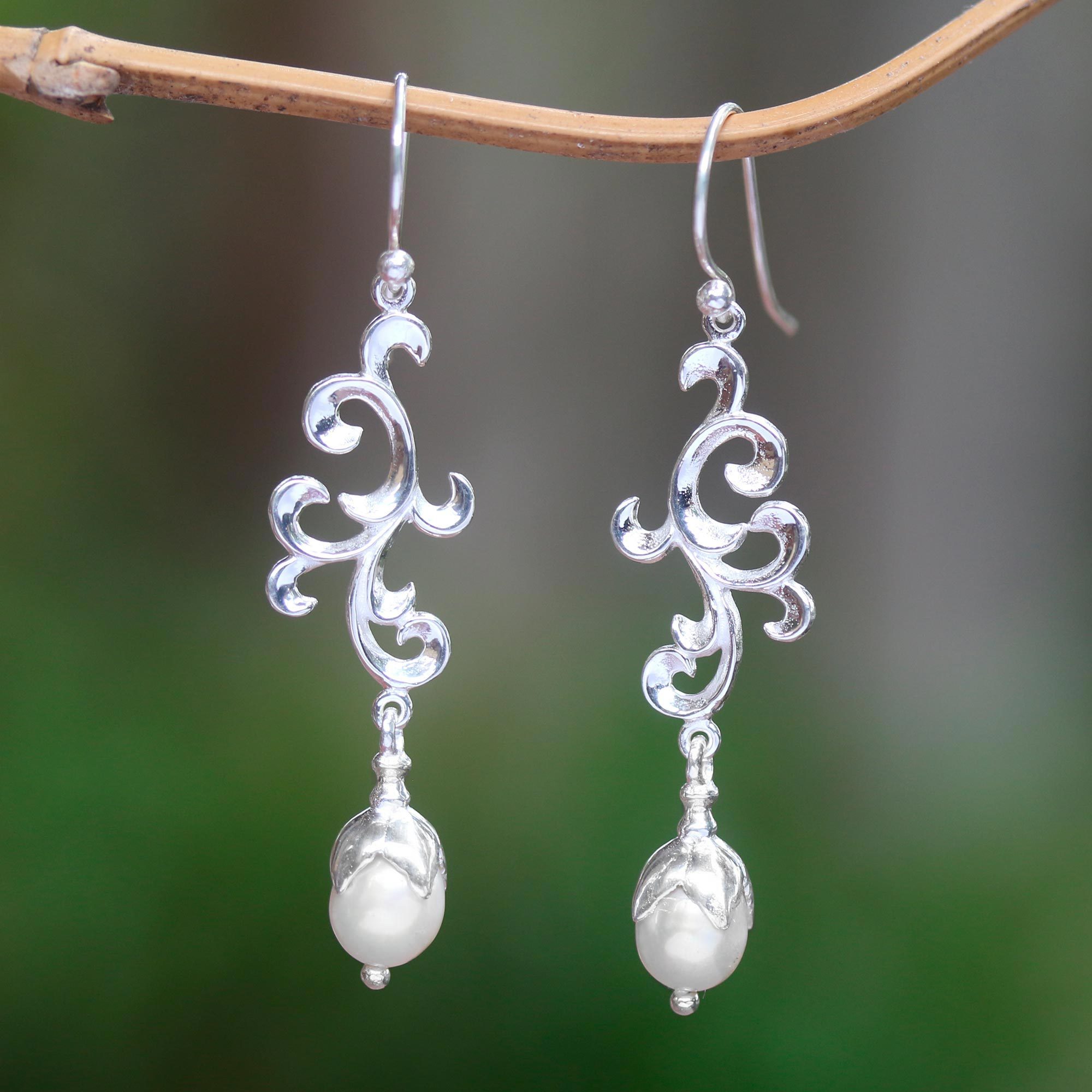 Sterling Silver and Cultured Pearl Dangle Earrings, 'Celuk Serenity'