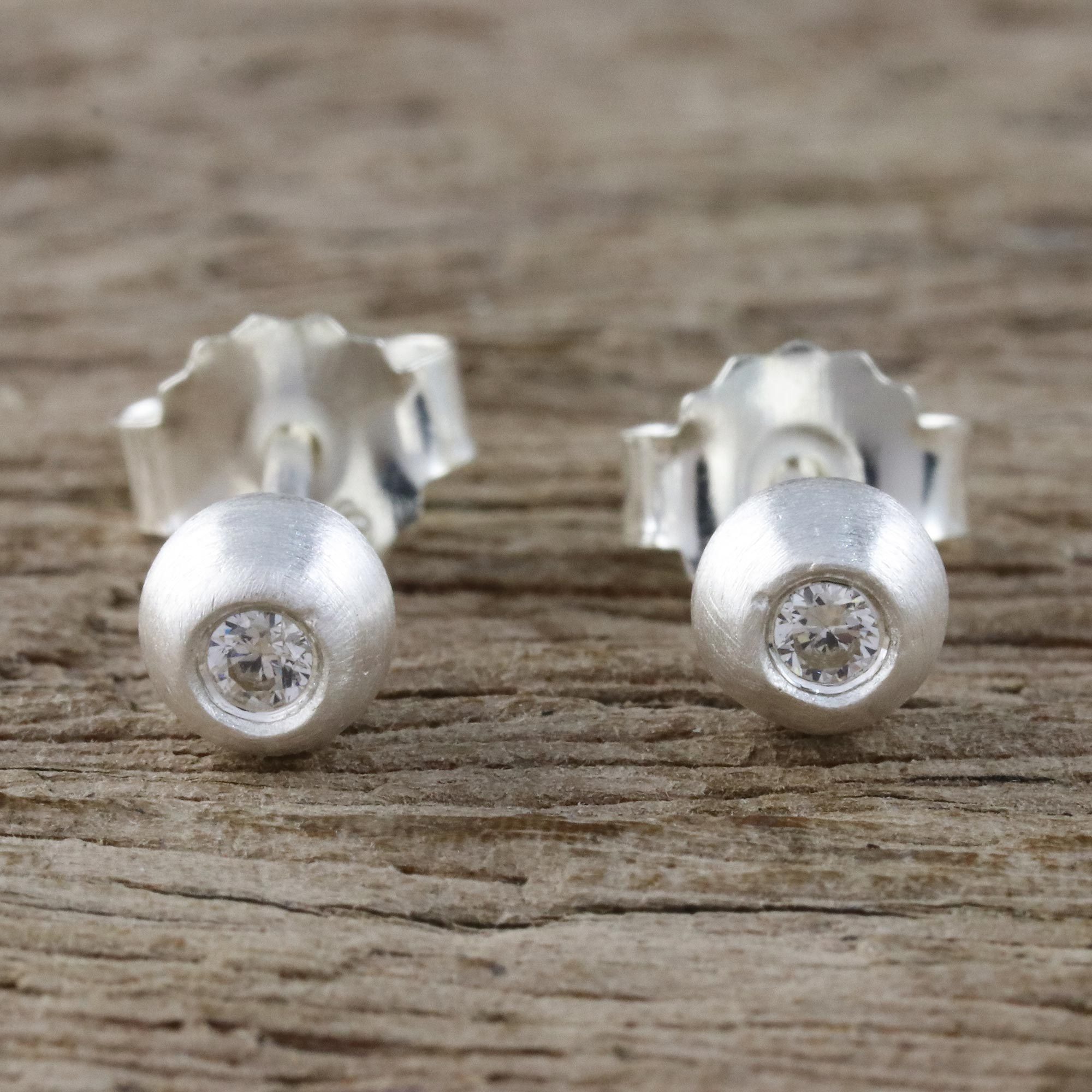 Featuring a simple, elegant design by Thai artisan Sarote Lochotinunt, this dainty pair of stud earrings is crafted of sterling silver. With a brushed-satin finish that captures the light, the each earring houses a petite sparkling cubic zirconia.