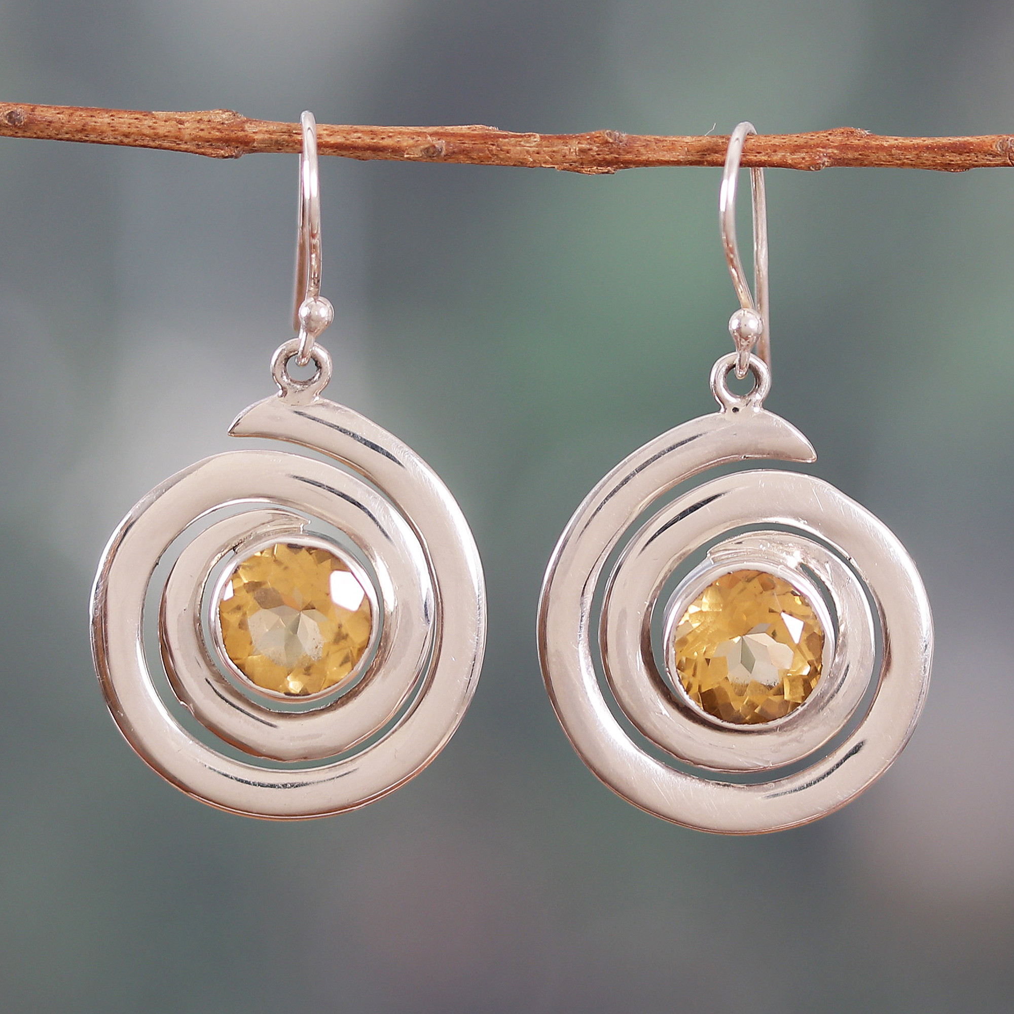 Handcrafted sterling silver swirls create a glorious pair of dangle earrings, now presented by Neeru Goel of India. Polished to create a captivating illusion, the accessories boast five-carat citrine jewels at the center, merging the silver and yellow hues to symbolize success and joy.