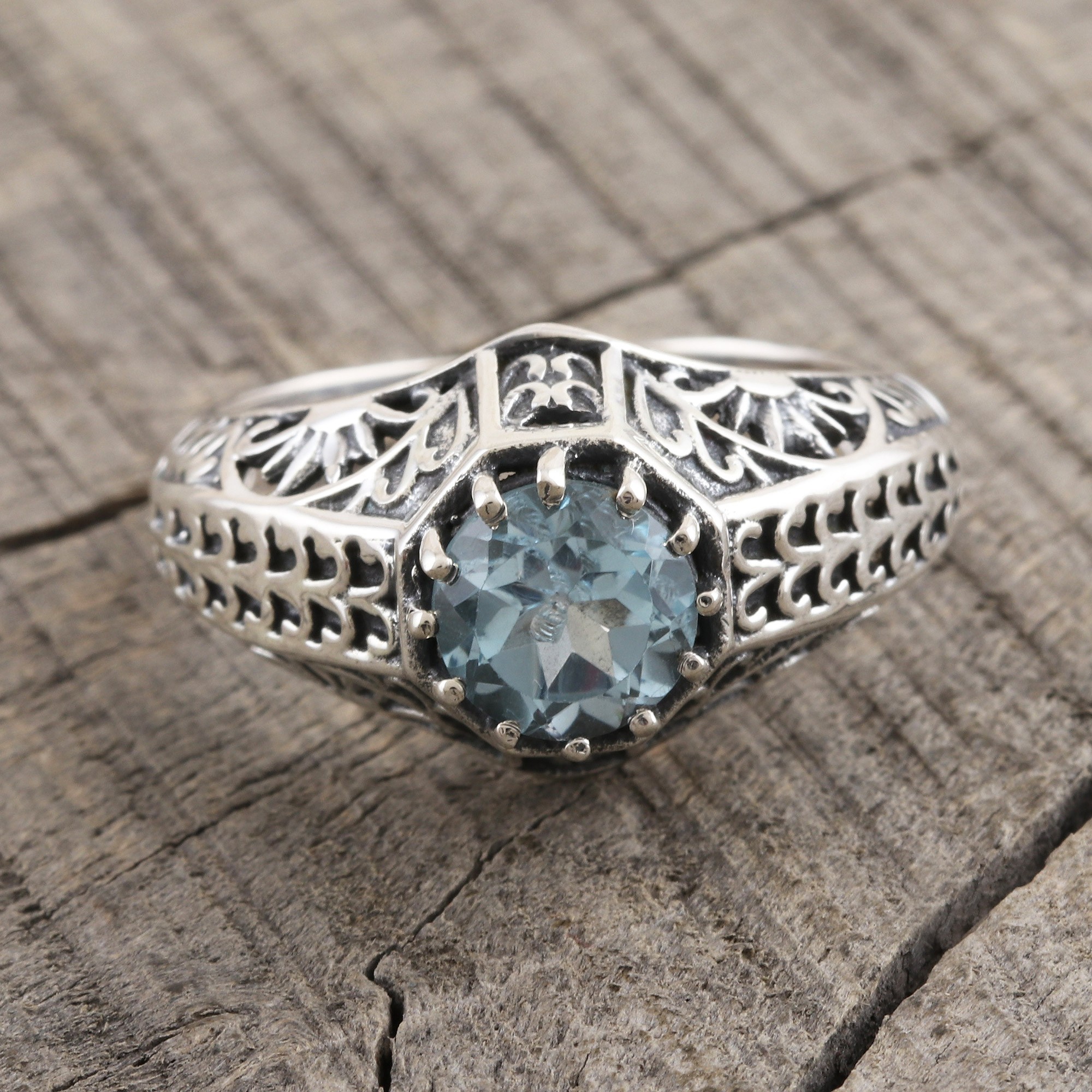 Vines, tendrils, and blooms inspire the design of this sterling silver ring by Rakesh Rana of India. At its center, a faceted blue topaz is set within a pronged crown. The design is oxidized to enhance the design.