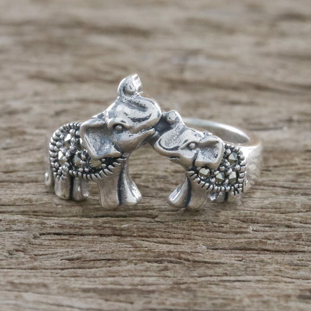 Sterling Silver and Faceted Marcasite Elephant Cocktail Ring, 'Mommy and Me'