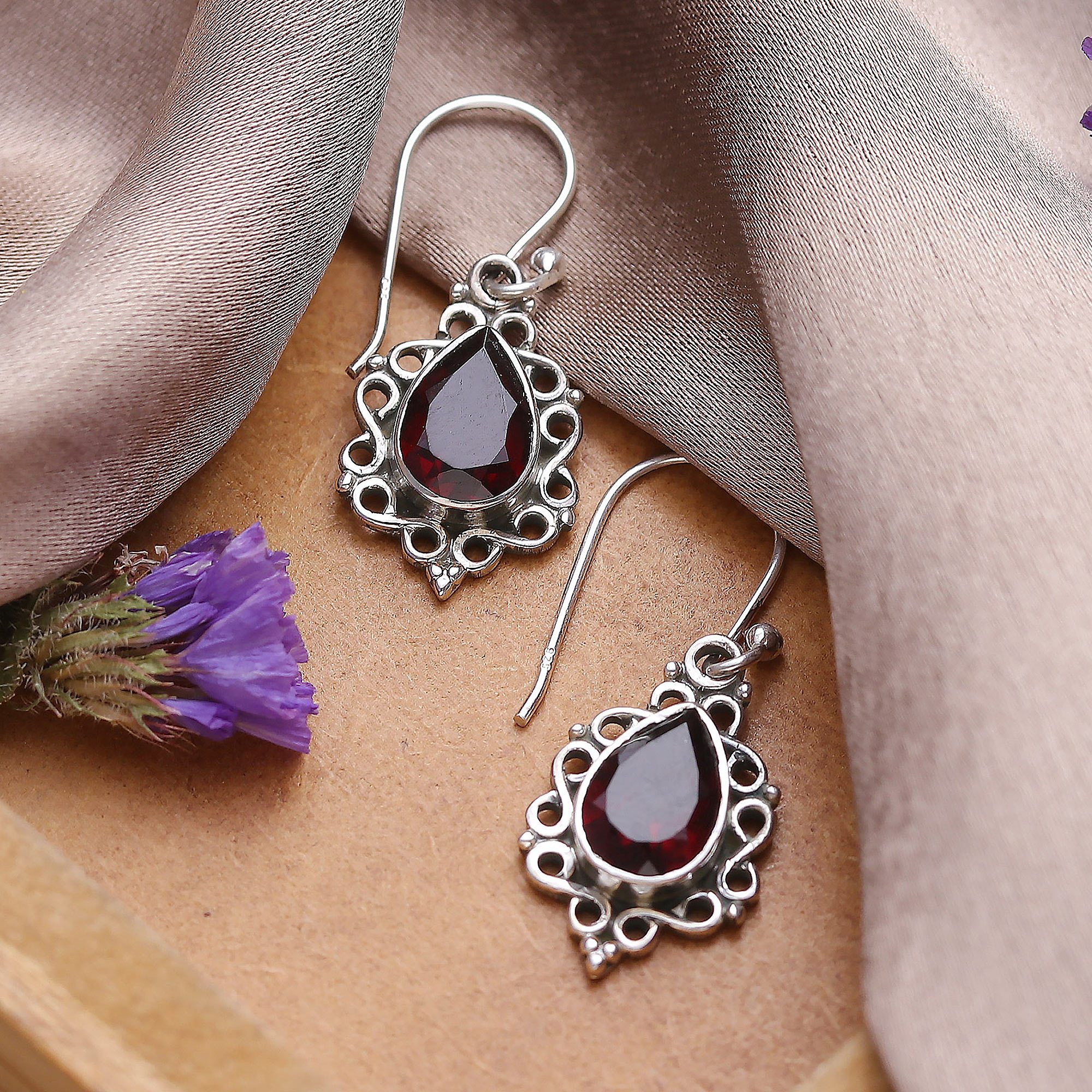 Sterling silver scrollwork forms a captivating frame for two glinting garnet gems in these earrings. From Neeru Goel, the four carats are faceted for sparkle and the dangles hang from polished sterling hooks.
