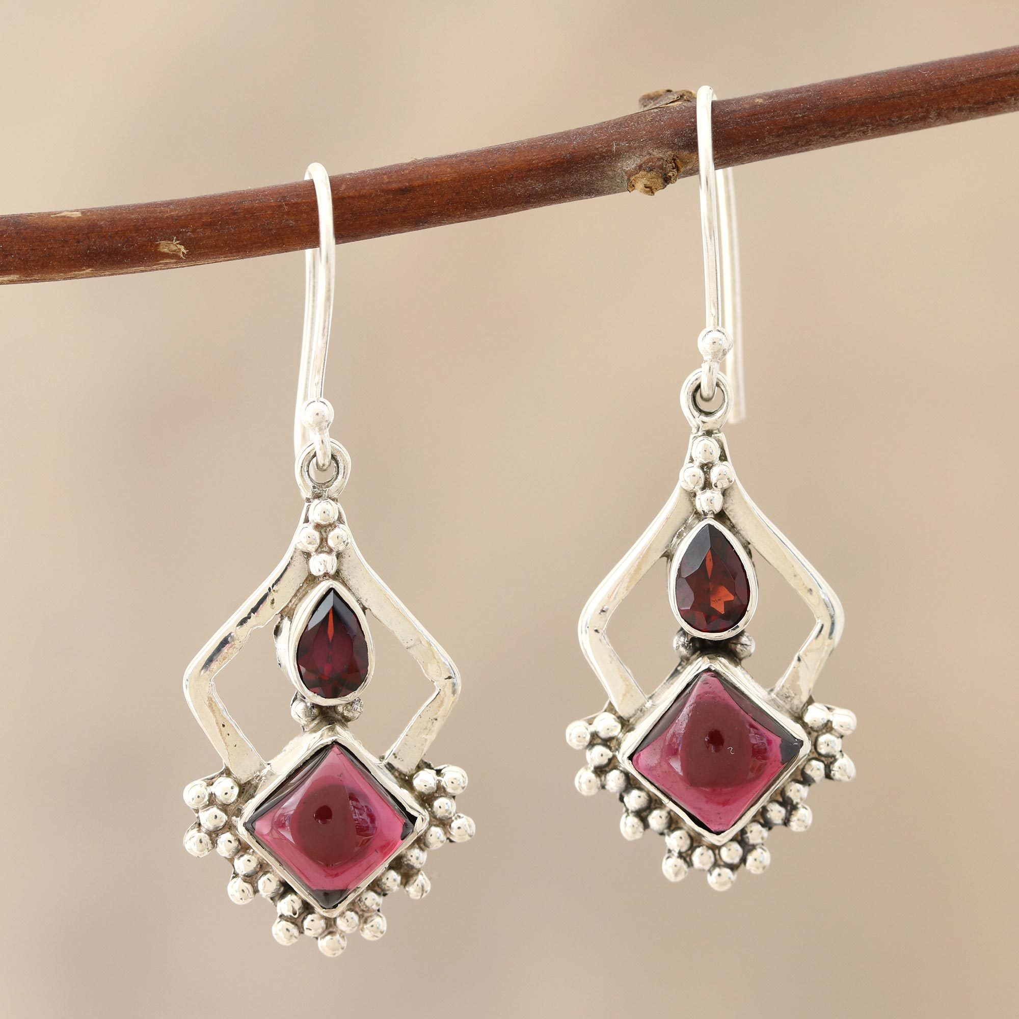 Silver granules known as rawa adorn these pretty dangle earrings from India's Neeru Goel. The sterling silver earrings are set with cabochon and faceted garnet with a rich glow.