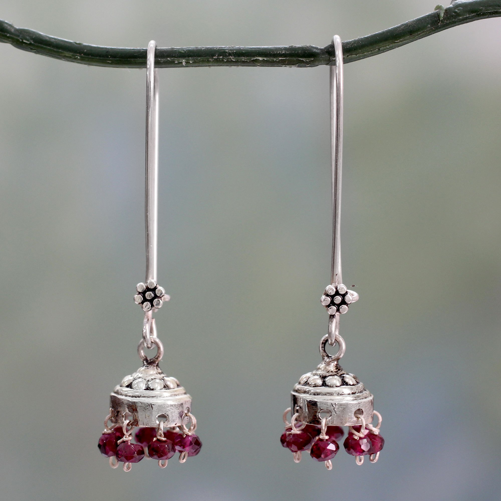 Sterling Silver and Garnet Jhumki Earrings from India, 'Bride of India'