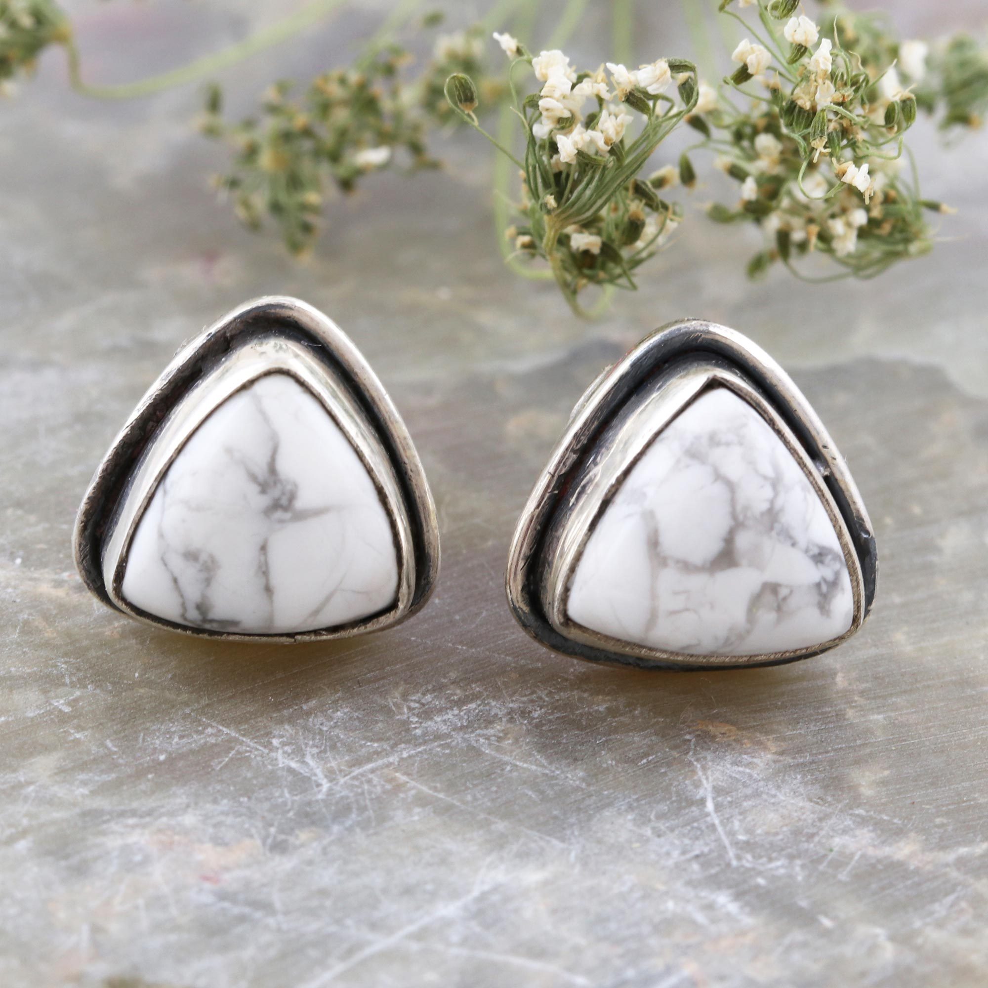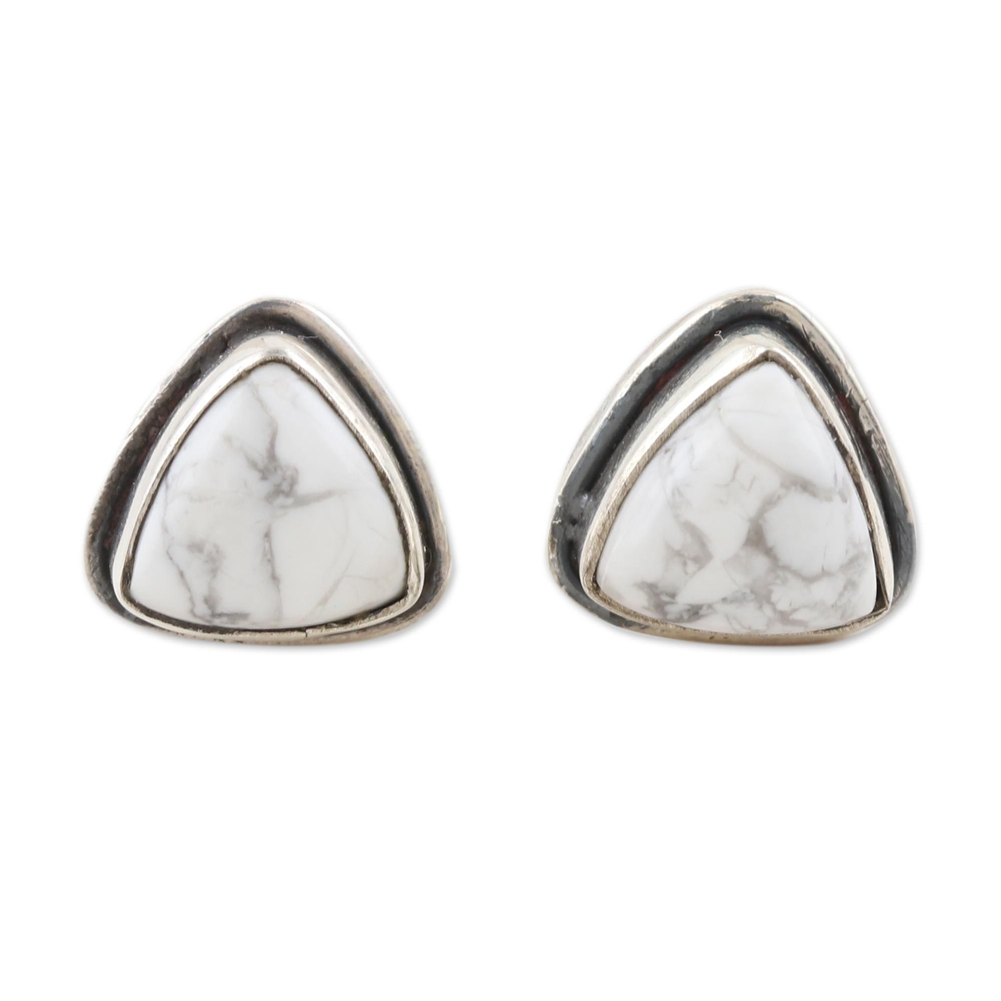 Sterling Silver and Howlite Stud Earrings, 'White Pyramid'