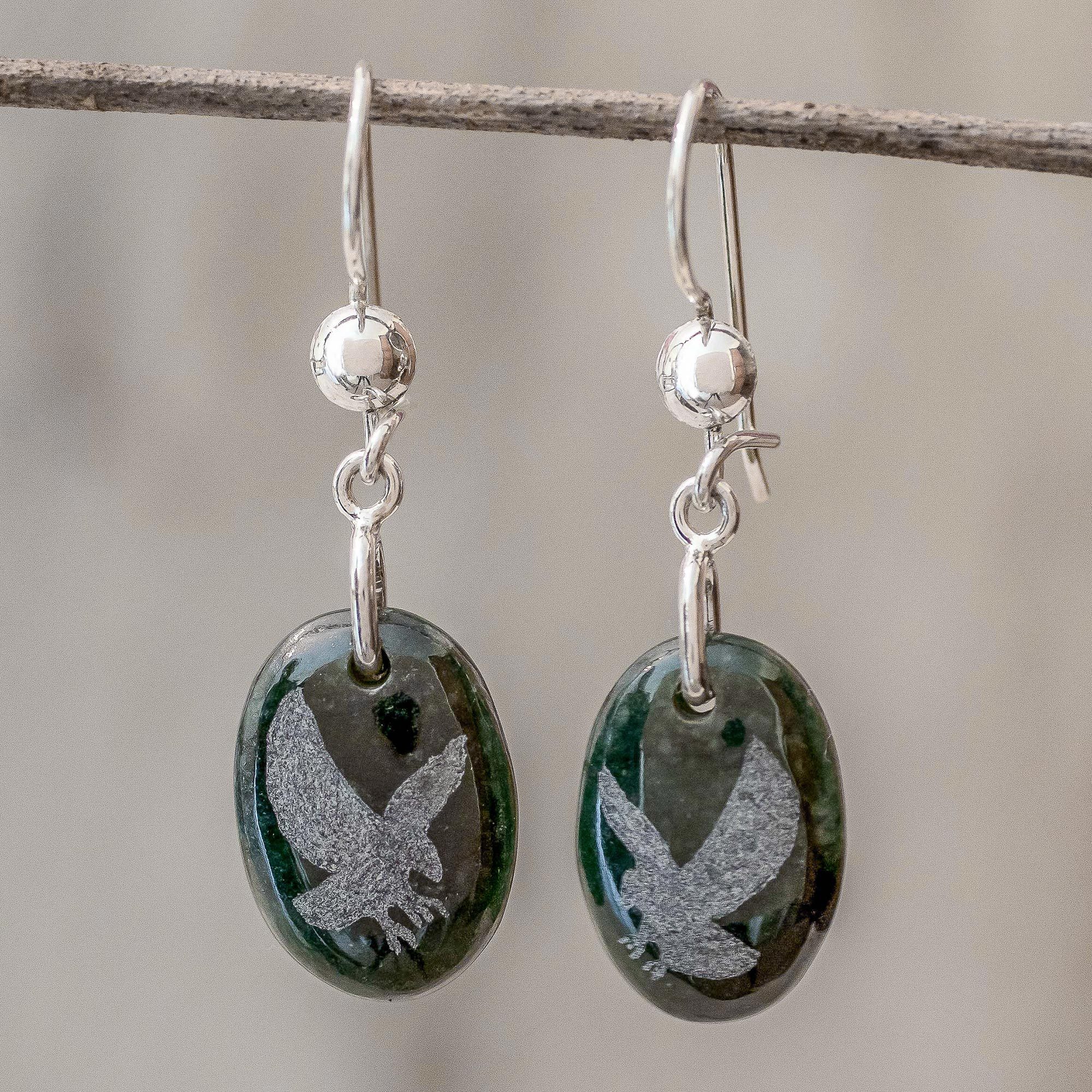 For the indigenous people of pre-Columbian America, especially the Mayas, the ya'ax chich or "jade" meant life, fertility and power. It was the most precious object, even above gold. These dangle earrings, by Guatemalan artisan Zandra Lorena Sajbin, feature dark green jade ovals on silver ear wires with an etched eagle design.