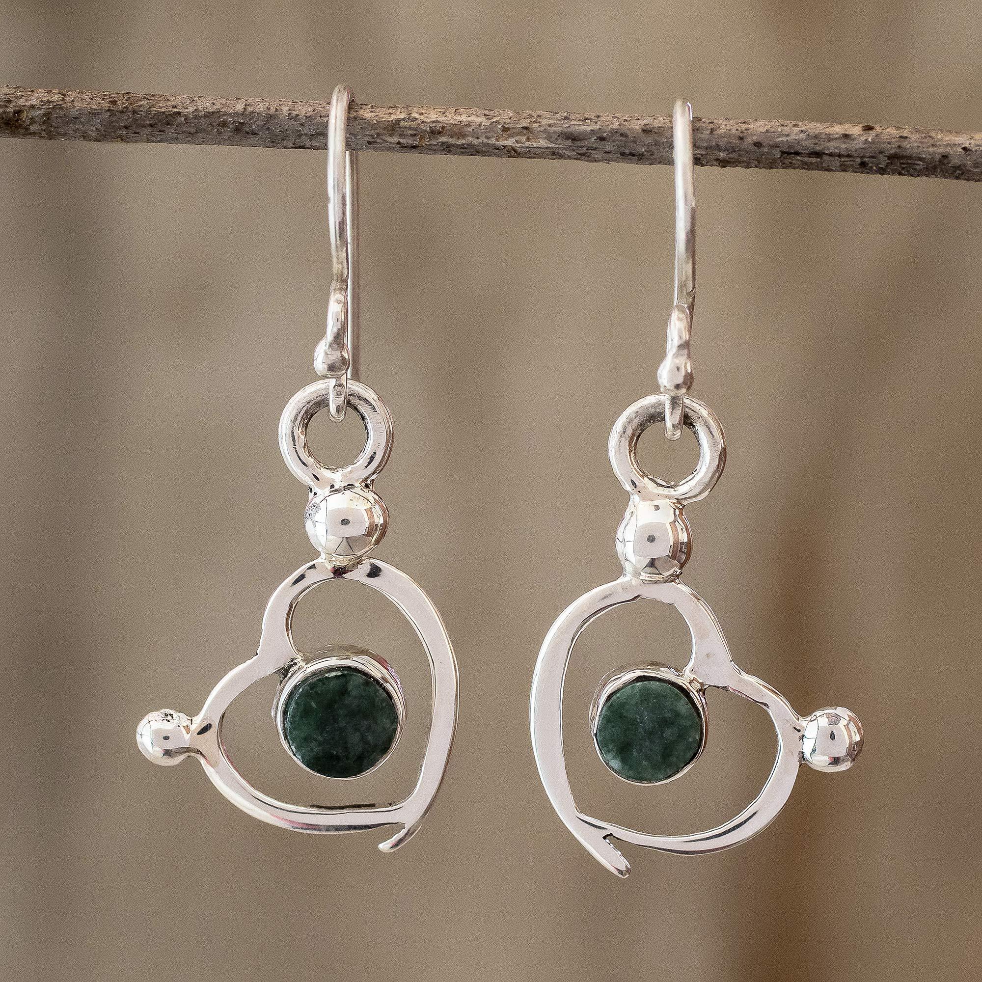 Sterling Silver and Jade Heart Dangle Earrings, 'Ancestral Love'