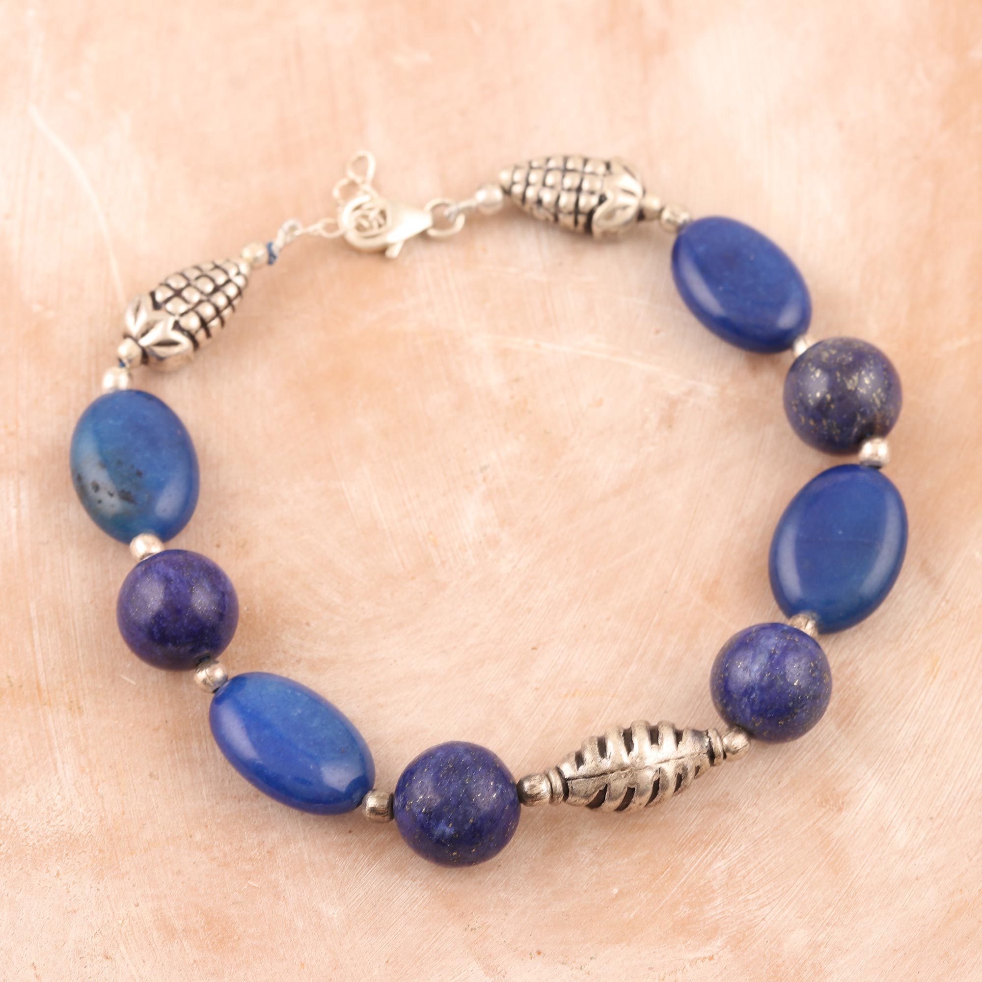 Designed by Shawn Martin in India, this beautiful blue bracelet is elegance itself. Combining two blue hues for subtle color play, the artisan hand crafts the bracelet from glossy lapis lazuli stones. Decorative sterling silver beads accent the gems with contrasting shine.
