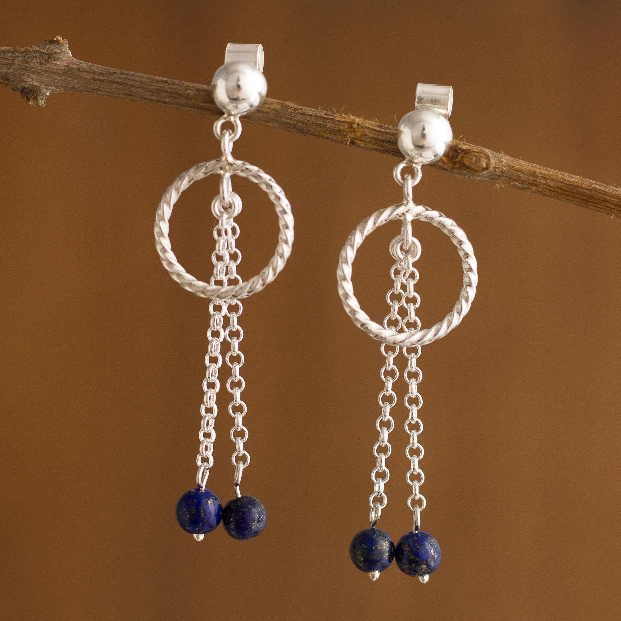 This dynamic pair of earrings is designed and crafted by Peru's Juan Luis Quispe. Globes of lapis lazuli swing freely at the end of silver chains that are suspended from rope-motif rings.