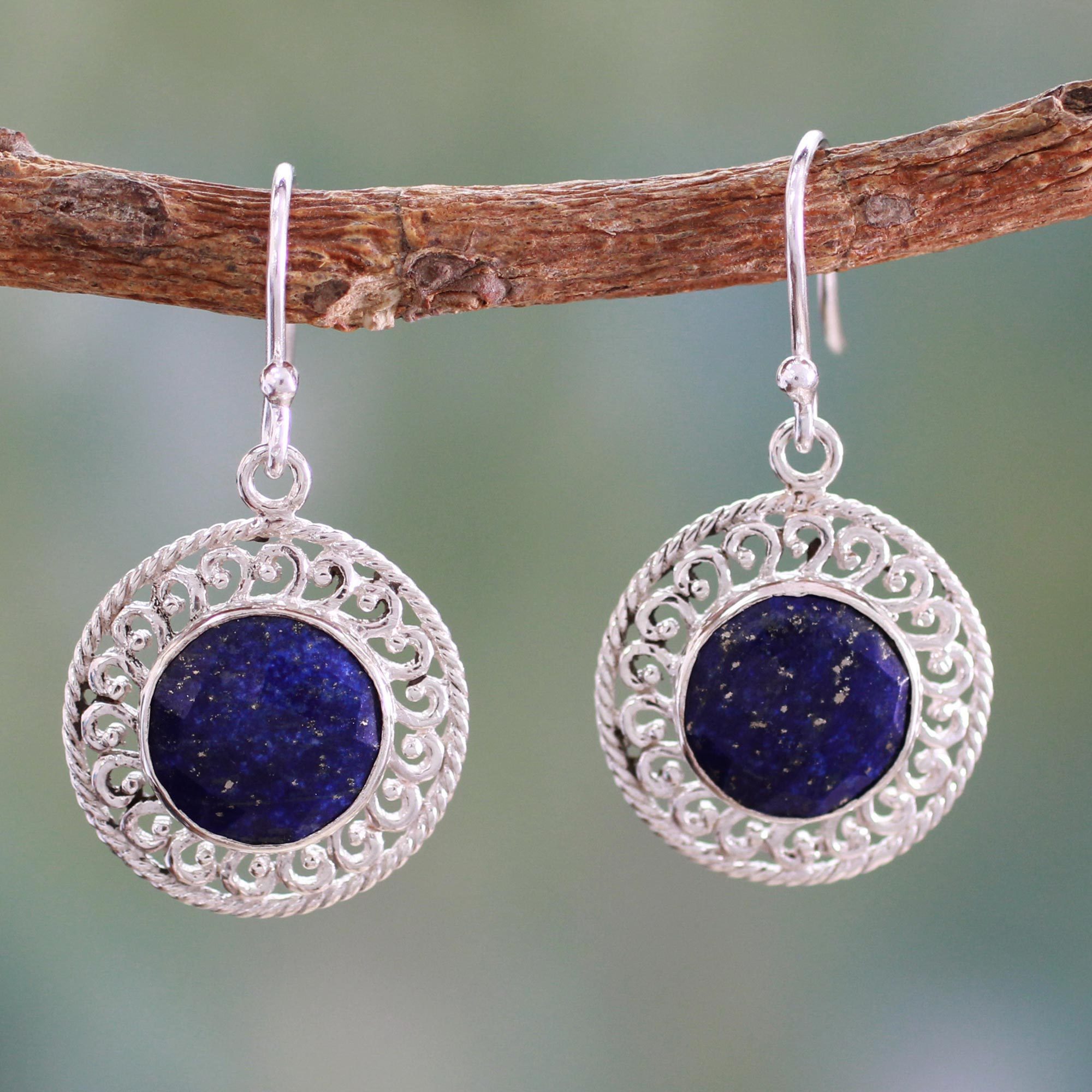 Dazzling with Indian artistry, these sterling silver earrings are designed by Shubhra Singh. She selects lapis lazuli to center the handcrafted medallions. Discreet facets enhance the gems' rich beauty.
