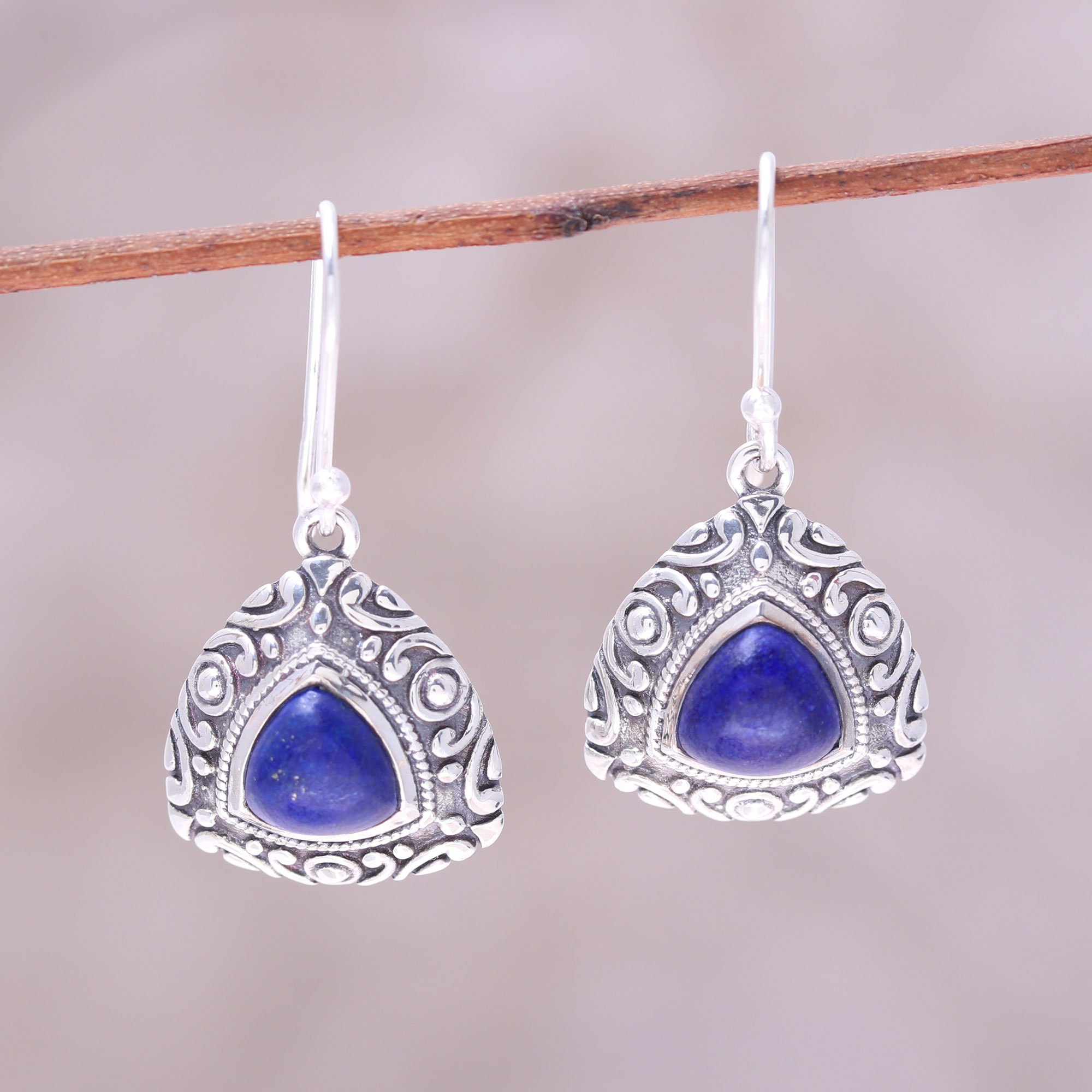 From Neeru Goel, these handcrafted earrings are awe-inspiring and mysterious as the blue night sky. Sterling silver triangles showcase charming lapis lazuli, their gold flecks contrasting attractively against the vivid blue. Lapis lazuli is said to relieve anger and negative thoughts, bringing a positive vibe to the wearer.