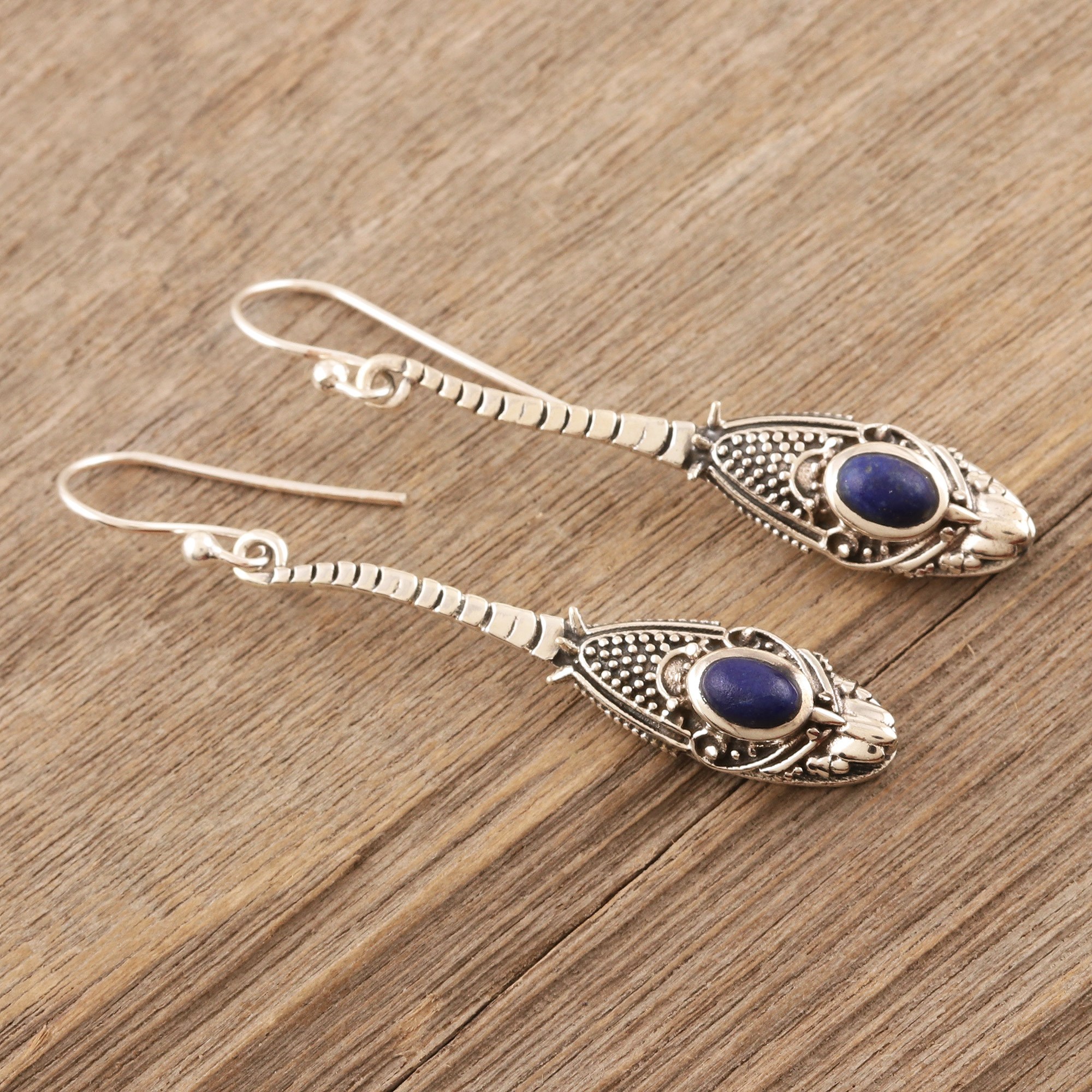 Neetu Barathi's mesmerizing snake earrings are sure to charm you. The Indian artisan hand crafts the earrings from sterling silver in a combination finish, while smooth lapis lazuli gems in bezel settings give the reptiles an air of royalty.