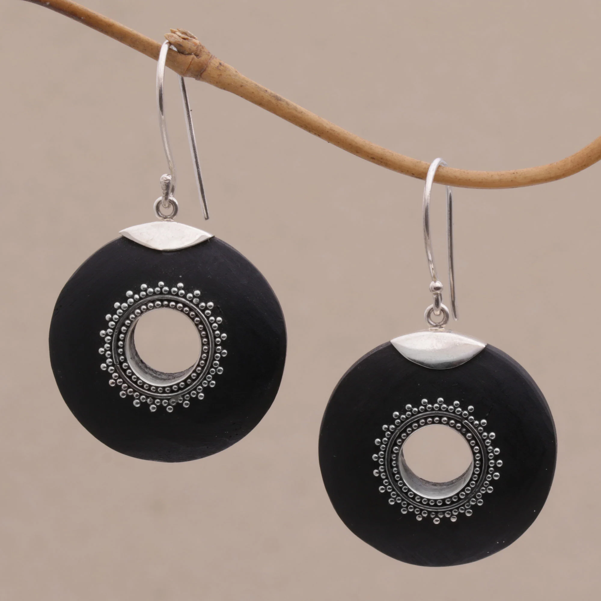 Rupadana handcrafts this pair of Balinese dangle earrings with circular lava stones. He carves a hole in the center of each stone, accenting the earrings with sterling silver dot motifs. Gracing the ears on hooks, these starlight earrings will light up any room.