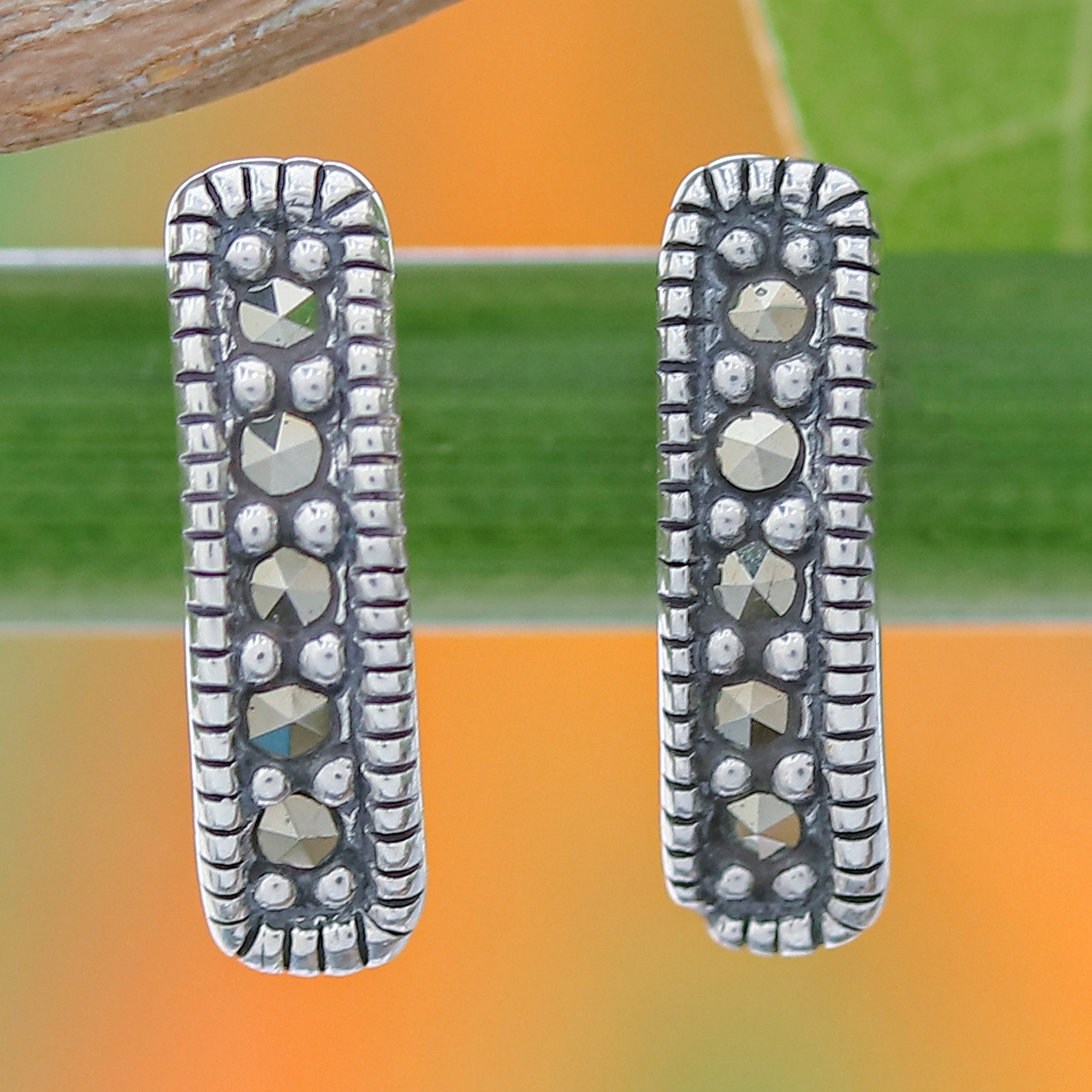 Thai artisan Narinee presents this dazzling pair of drop earrings. Made from 925 sterling silver, the elegant earrings are bar-shaped and studded with sparkling marcasite.