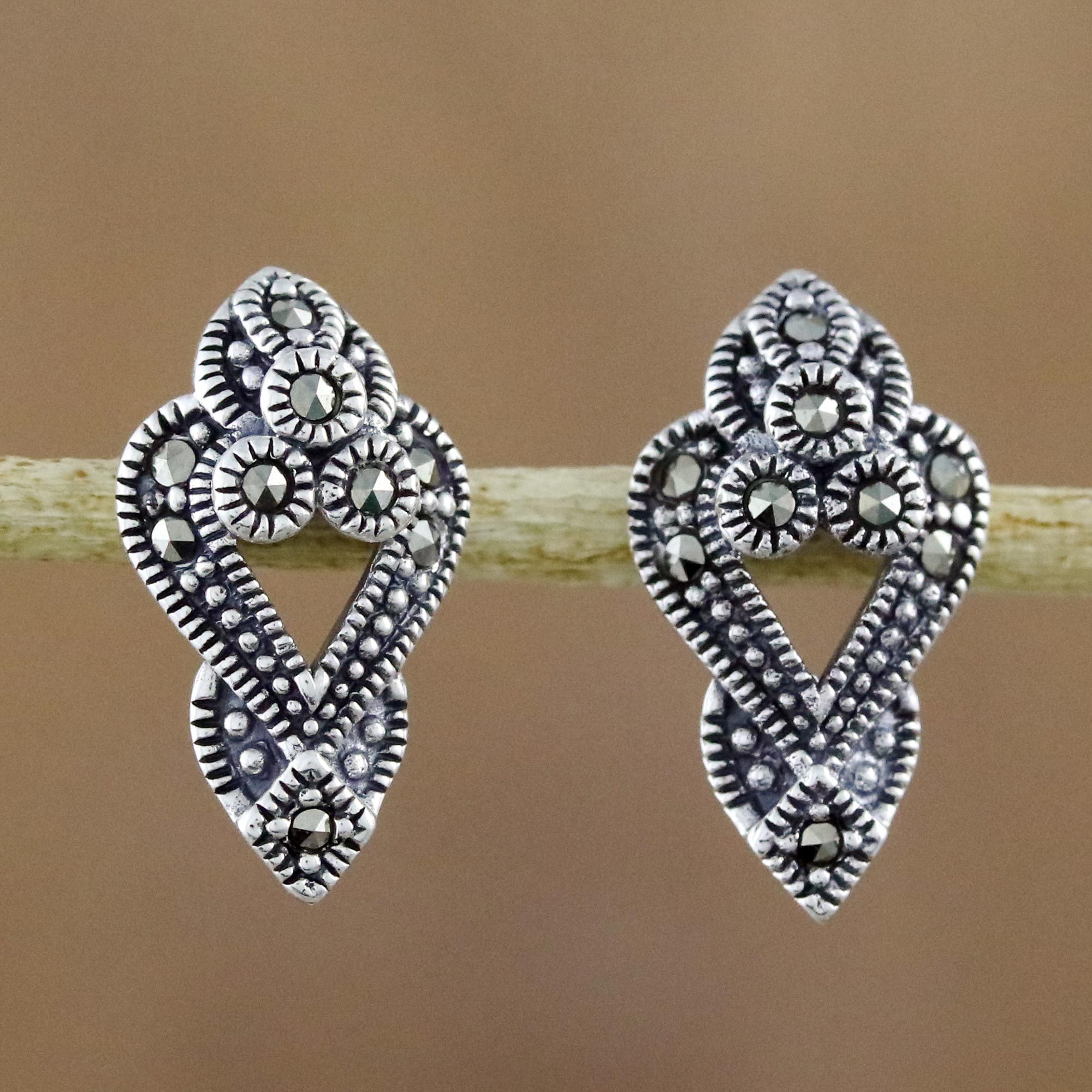 Artisan Narinee of Thailand has a particular passion for marcasite; she uses it in most of her jewelry designs. Here she places the glittering gems in sterling silver crests for an elegant pair of drop earrings. Because of its popularity in the Victorian era, marcasite lends jewelry a wonderful vintage look.