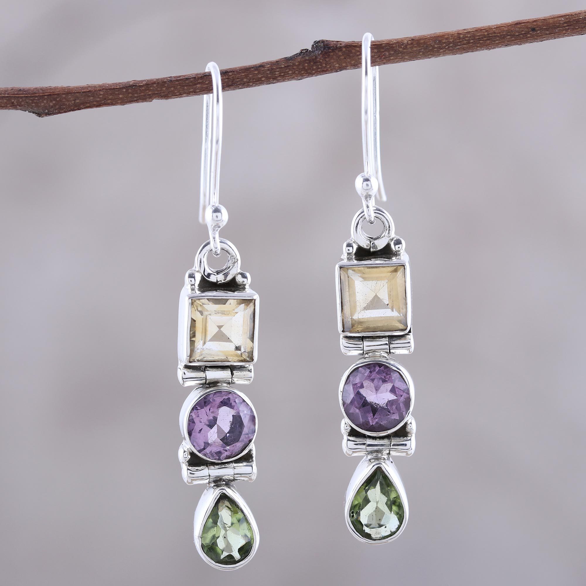 A trio of gemstones dangle gracefully from sterling silver hooks in this pair of earrings presented by Neeru Goel of India. The handcrafted earrings feature a square of citrine atop a round peridot atop a teardrop of amethyst all set in sterling silver and connected by sterling silver hinges.