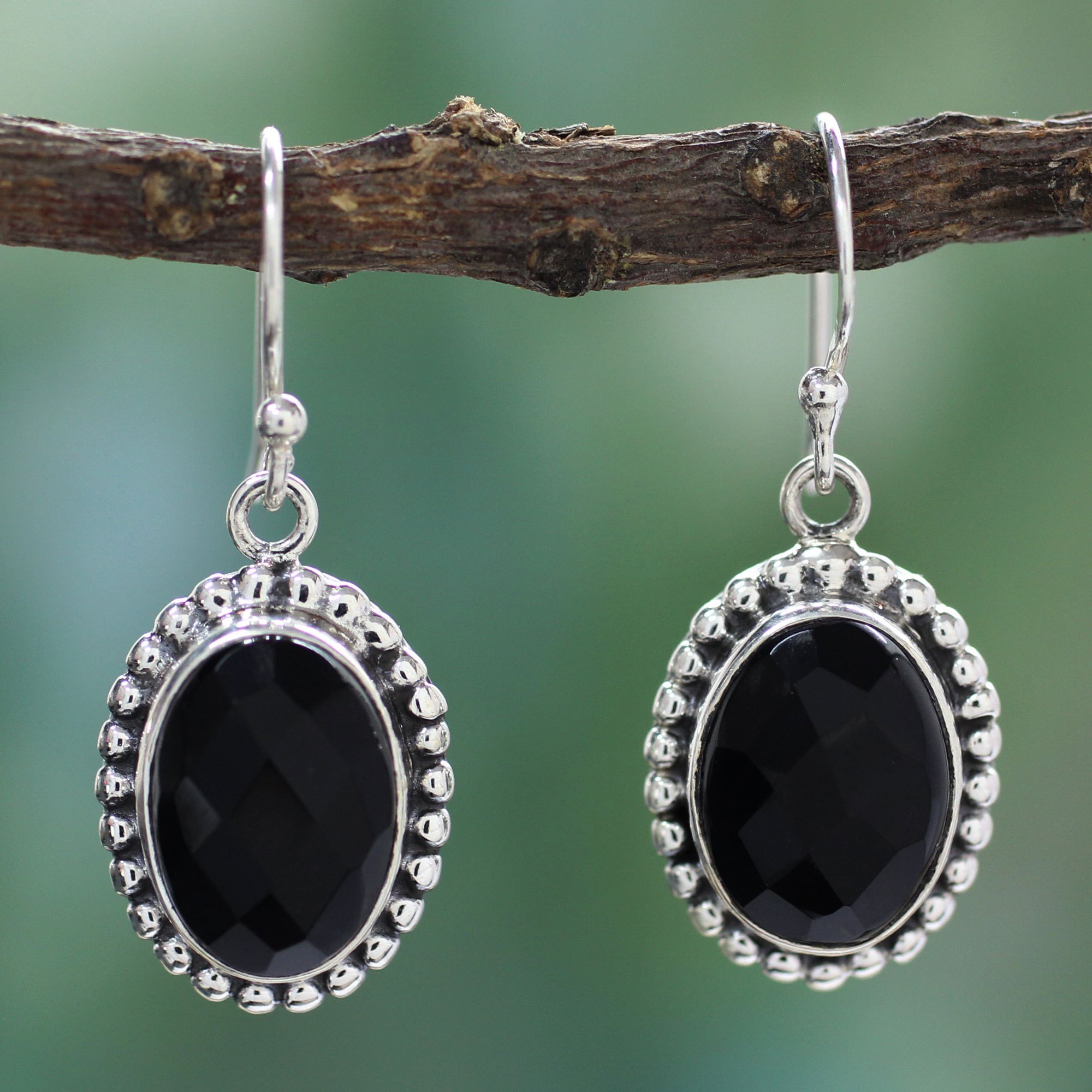 Discreet yet decidedly elegant, these earrings are from Shanker in India. The sterling silver earrings are crafted by hand with beaded details. Glossy faceted onyx gems complete the design.