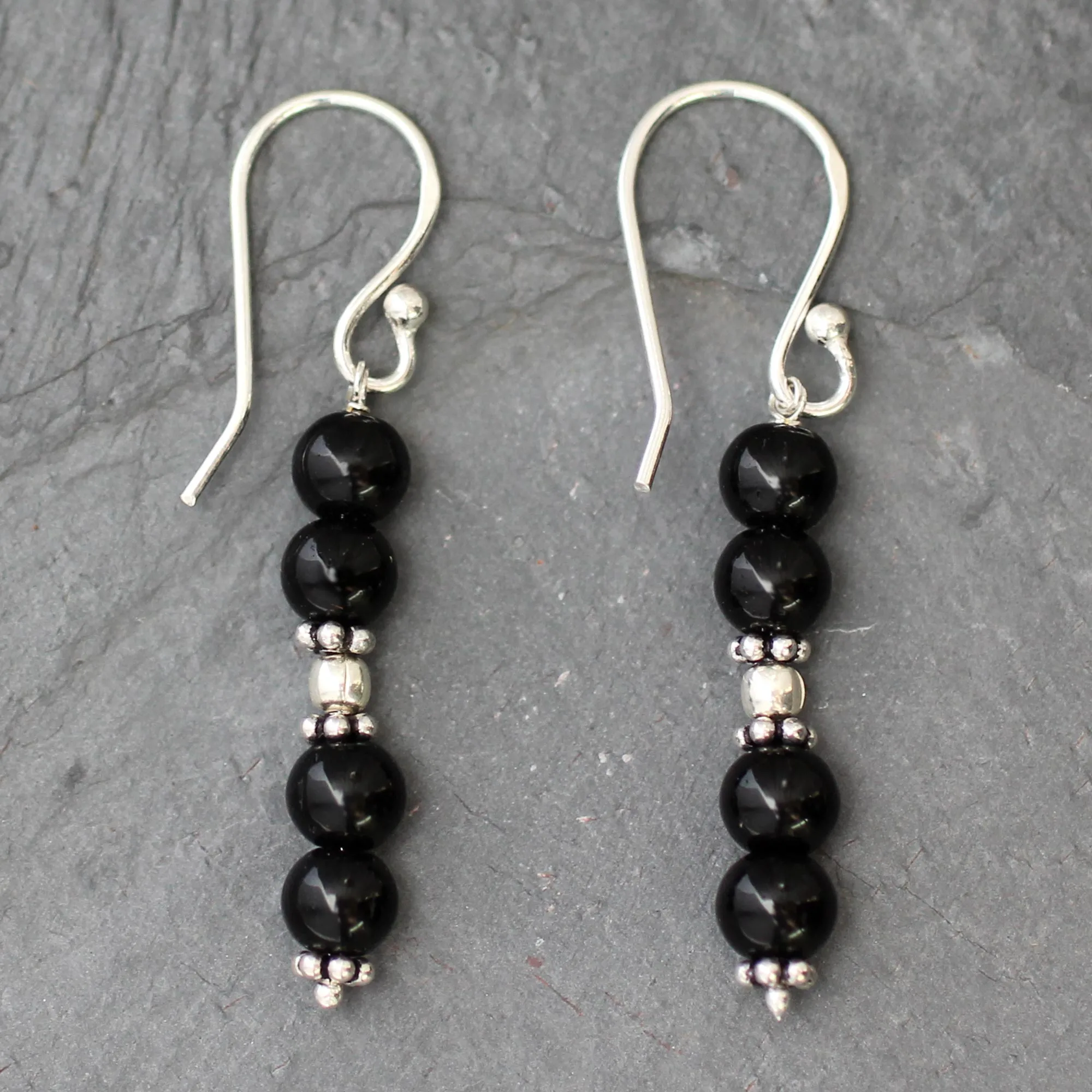 Dress to impress with these shiny black onyx and silver earrings dangling from your ears. Presented by Narayani from India, created out of Sterling silver these earrings are hand beaded with polished onyx globes centered with a silver globe and accented with tiny silver beads. Look stylish and sophisticated when you wear these cute little black onyx dangle earrings with your attire.