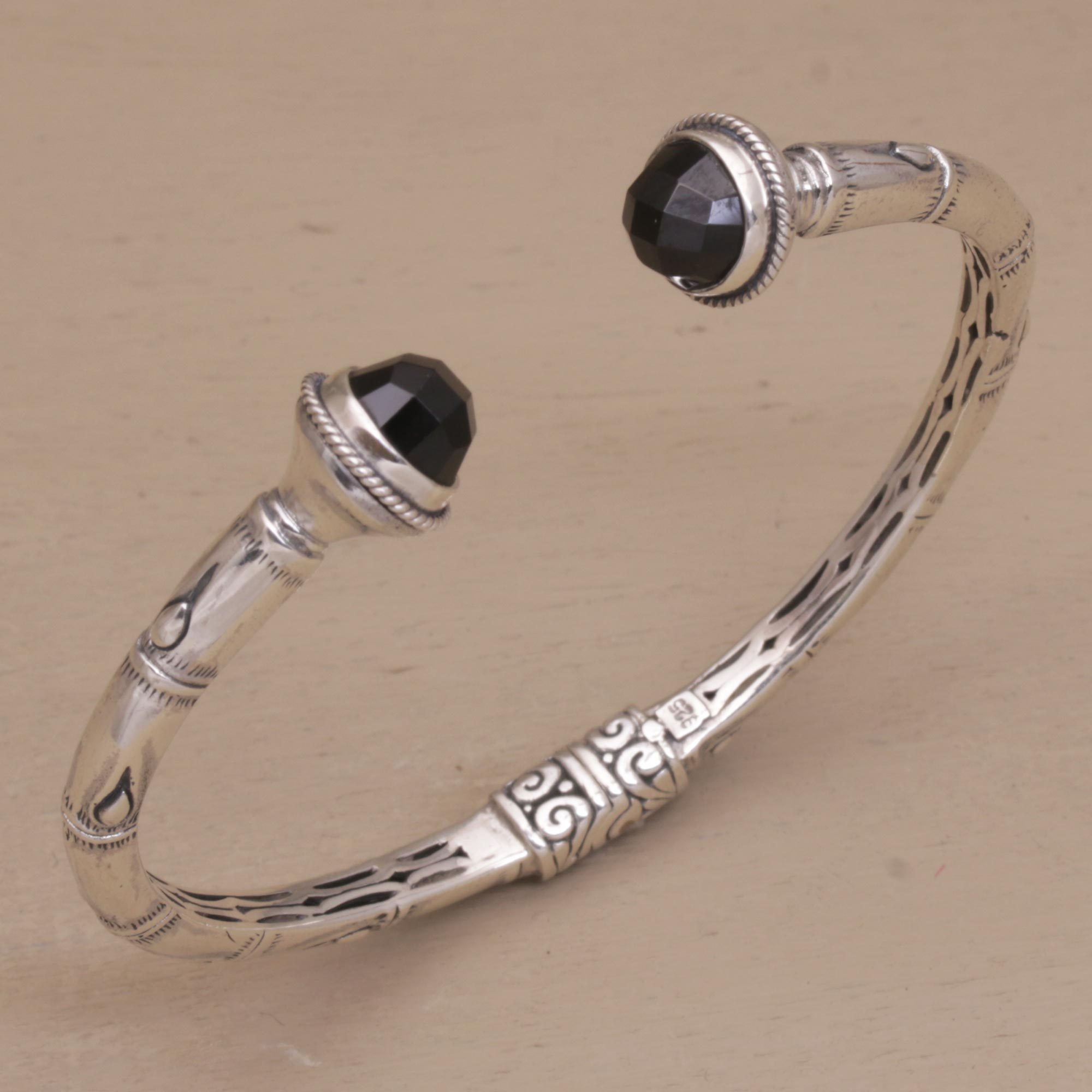 Deep in conversation, faceted gemstones face one another. This beautiful bracelet from Komang Wijayana comes to life in sterling silver with the textures of bamboo. Set with onyx, the artisan-crafted cuff features a hinge at the back.