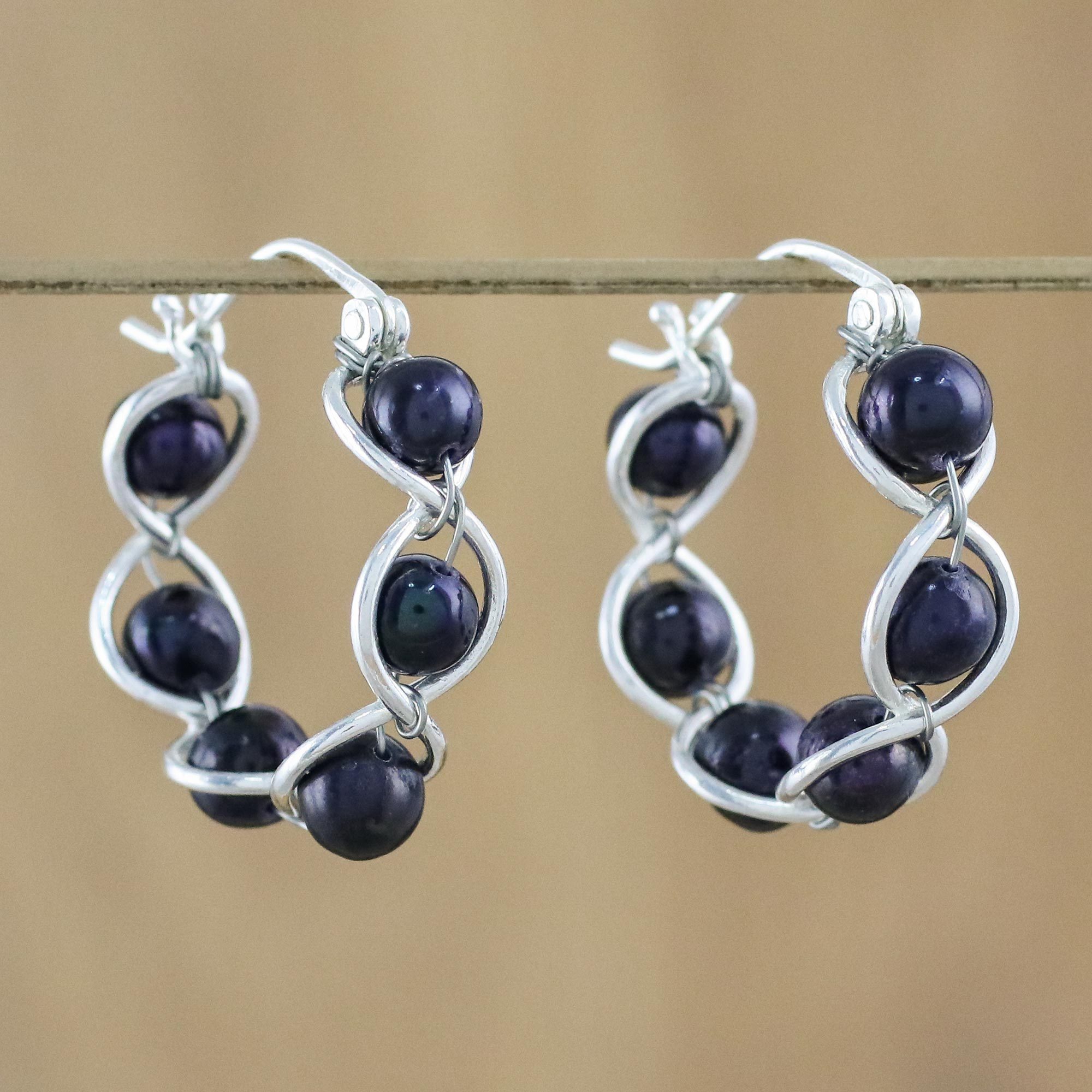 Sterling Silver and Pearl Hoop Earrings, 'Shadow Twist'