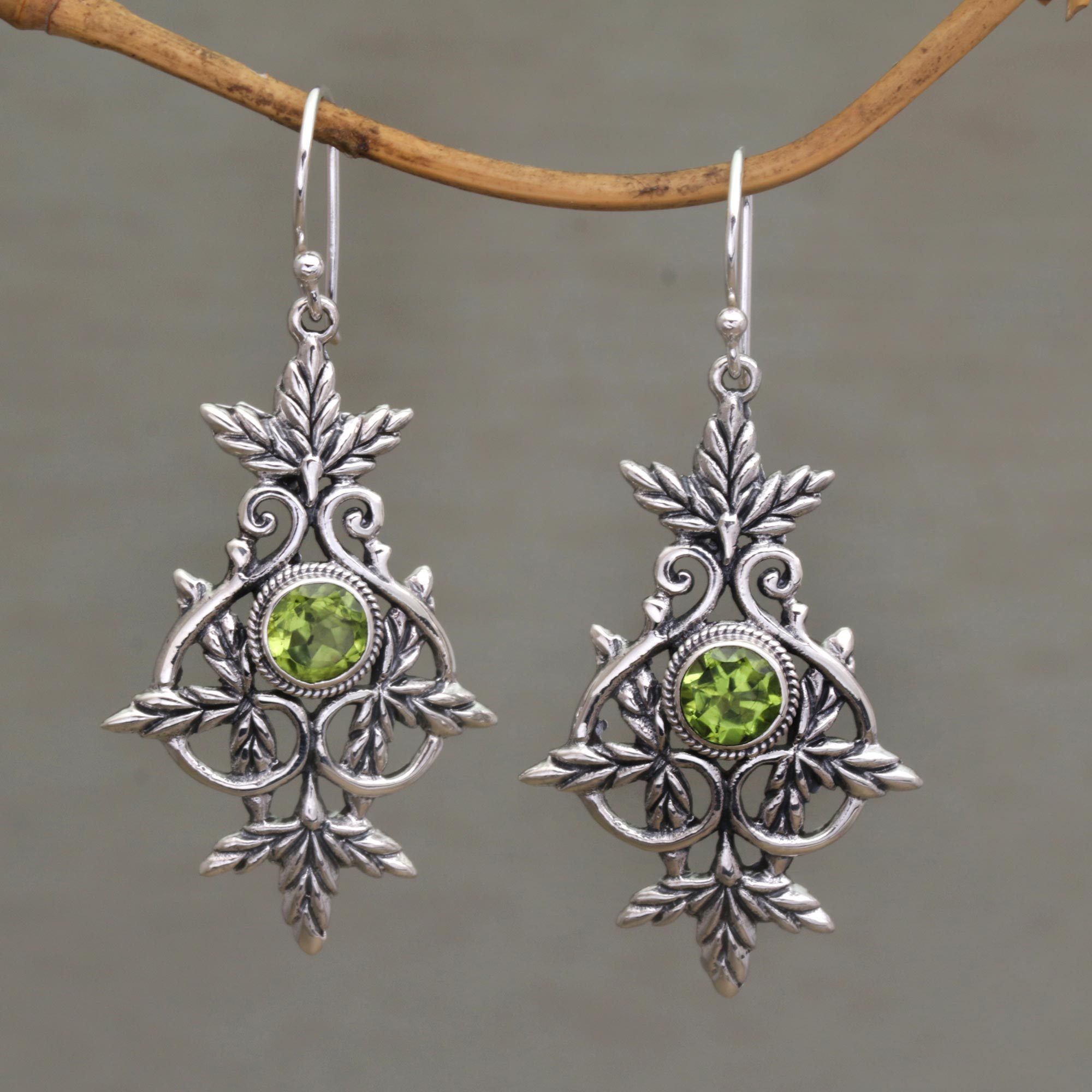 With a design that hints of yesteryear, these sterling silver earrings make an elegant statement. Nyoman Rena crafts the earrings from sterling silver with leaf motifs and silver flourishes. Sparkling peridot totaling 1.5 carats centers the earrings, which swing from sterling silver hooks.