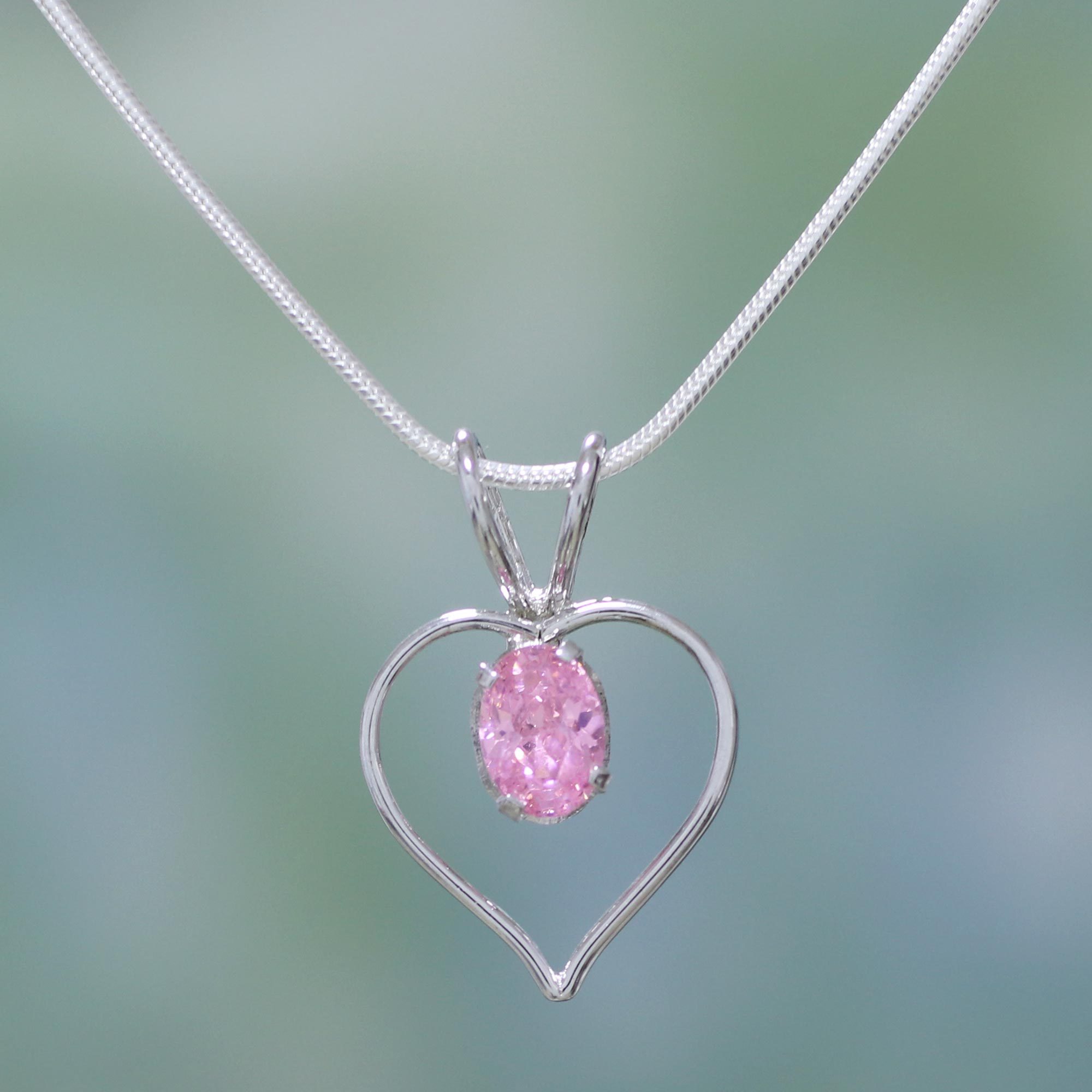 Sterling Silver and Pink Zirconia Heart Pendant Necklace, 'Valentine'