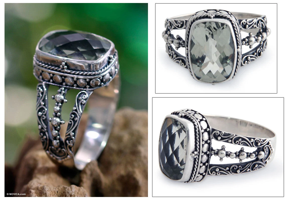Evoking a tranquil haven, Kadek Hendra selects prasiolite (green amethyst) for this unique ring. The faceted gemstone totals some 6 carats to center a Balinese design. Traditional motifs come to life through tendrils and granules in a handcrafted keepsake.