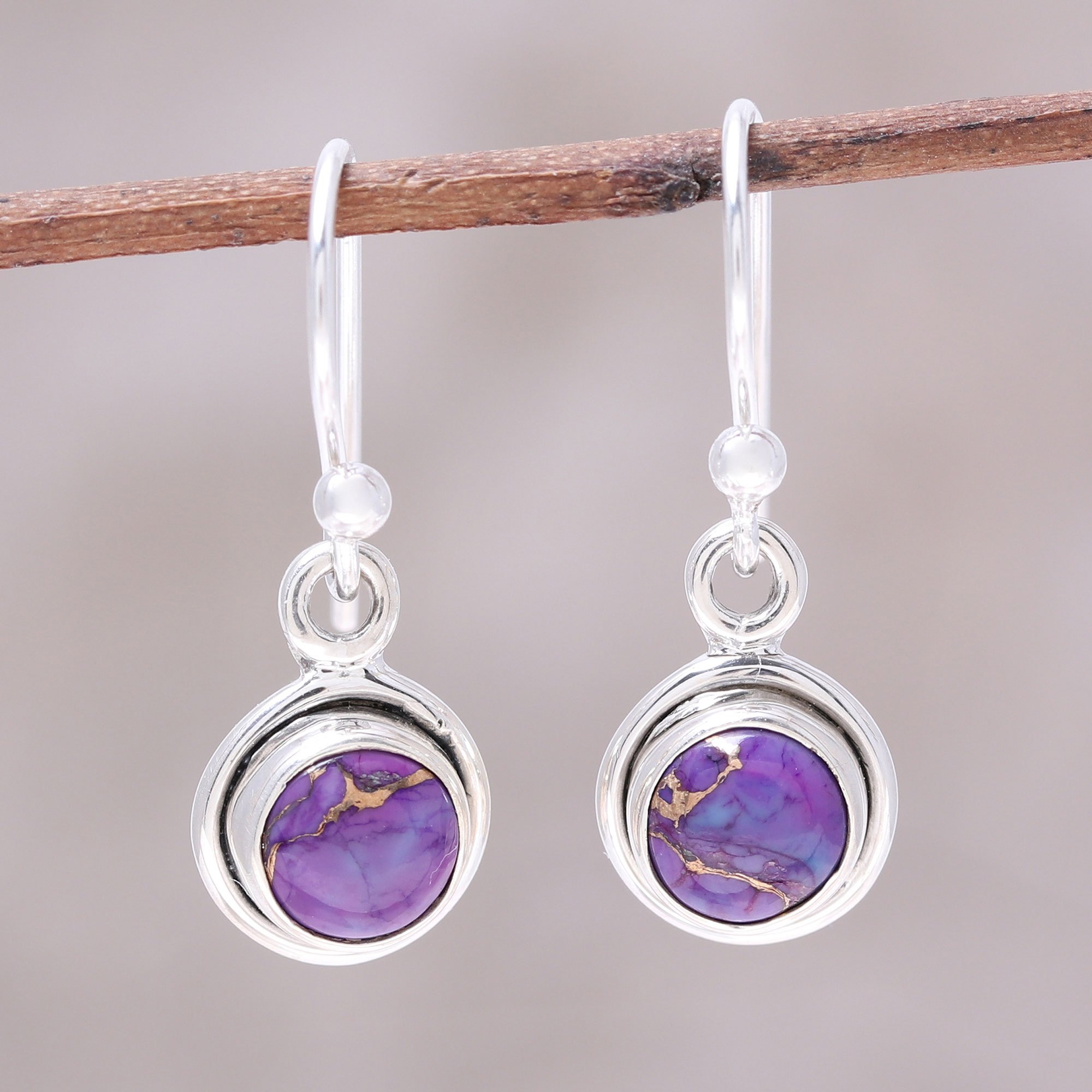 Crafted of purple composite turquoise with gold veins, two adorable moons form this pair of dangle earrings from India. Presented by Neeru Goel, the earrings are crafted of sterling silver with a high-polish finish.