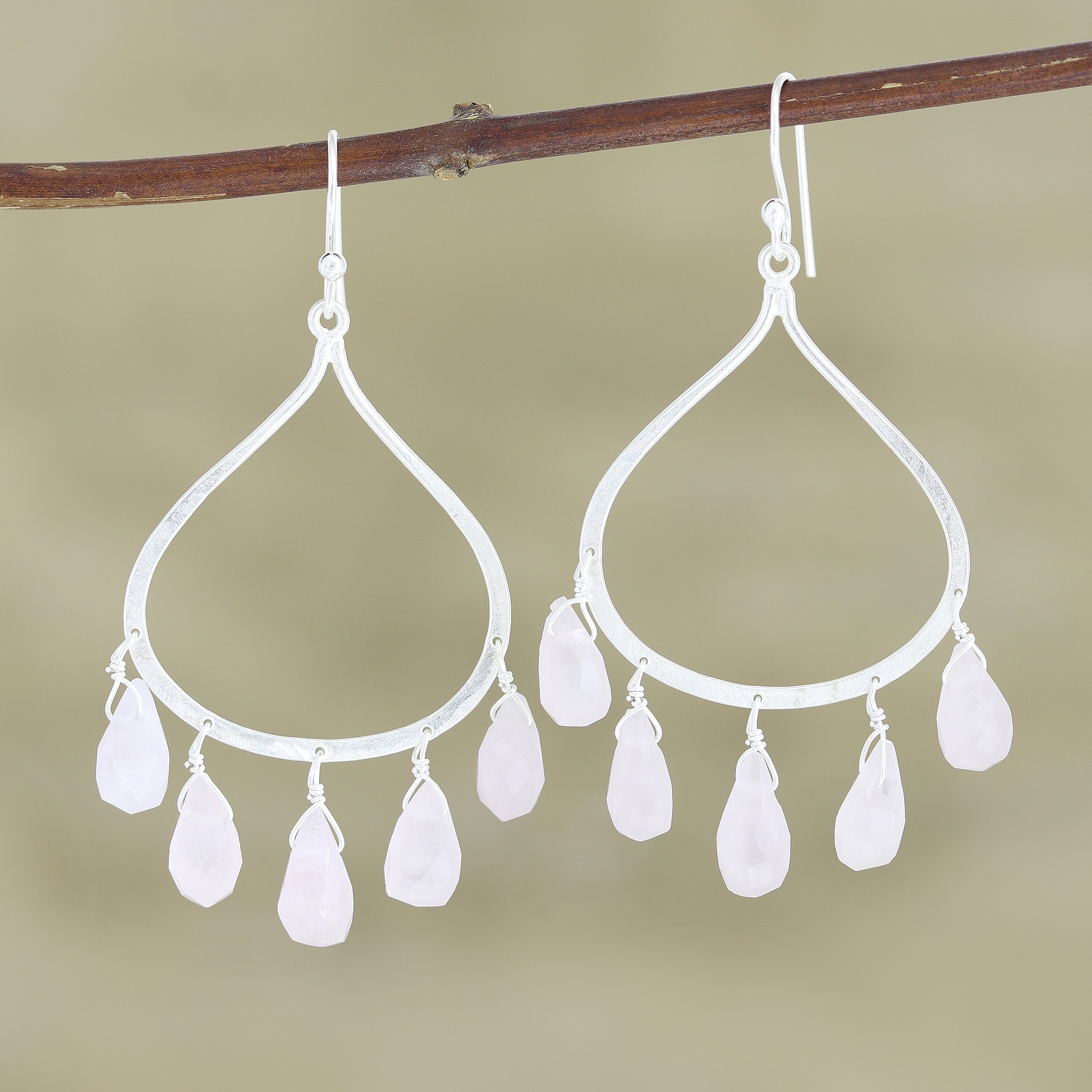 Passion, excitement, and romance will never feel far when you wear these feminine dangle earrings designed by Neetu Barathi and crafted by Indian artisans. A row of pale pink rose quartz gemstones dangle elegantly from a hollow teardrop-shaped frame crafted out of sterling silver, while gleaming silver hooks finish the pretty pair.