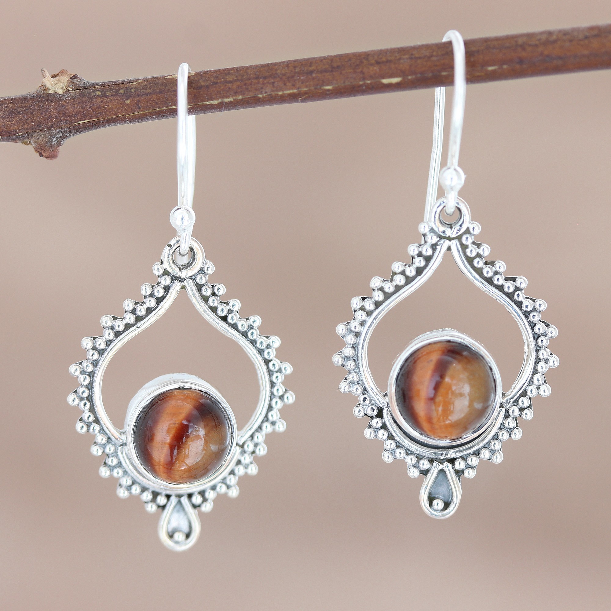 Show off your great taste in jewelry with these lovely earrings designed by India's Bhavya Jain. The artisan centers the pair with a round tiger's eye stone in a bezel setting, while a graceful sterling silver design frames the gem in elegance.