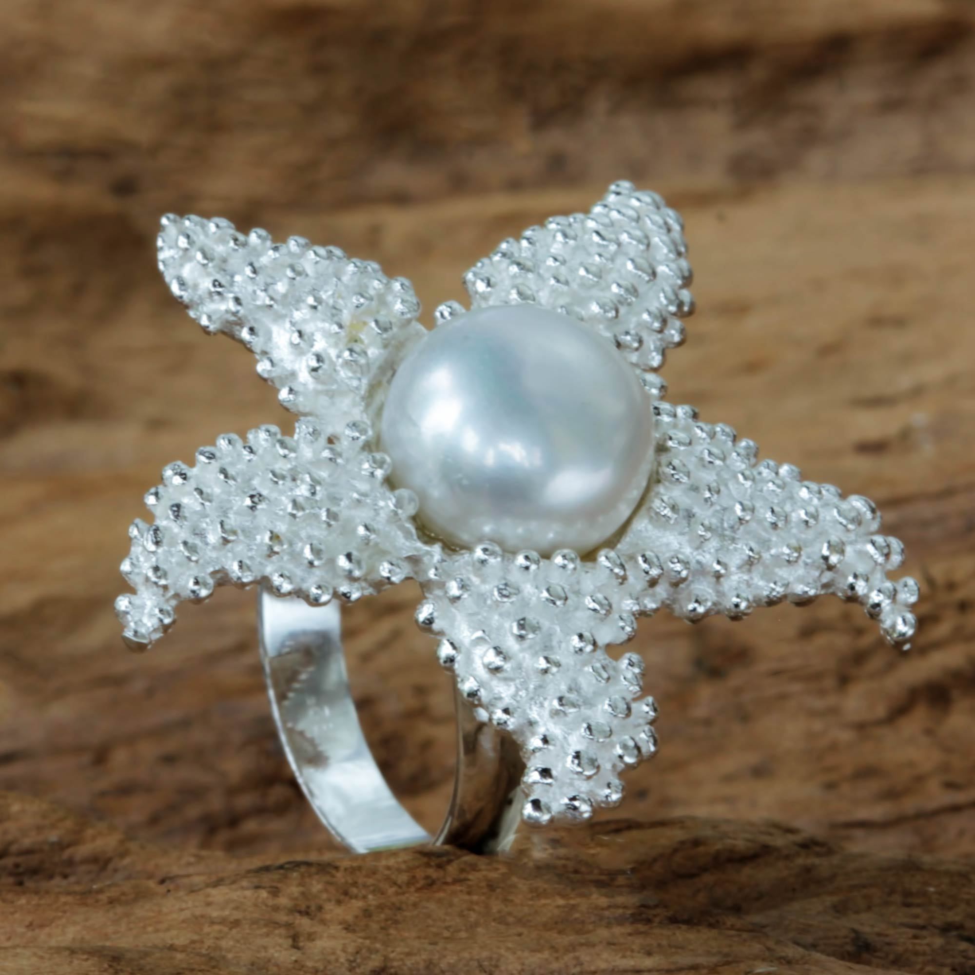 Sterling Silver and White Pearl Cocktail Ring, 'Sparkling Starfish'