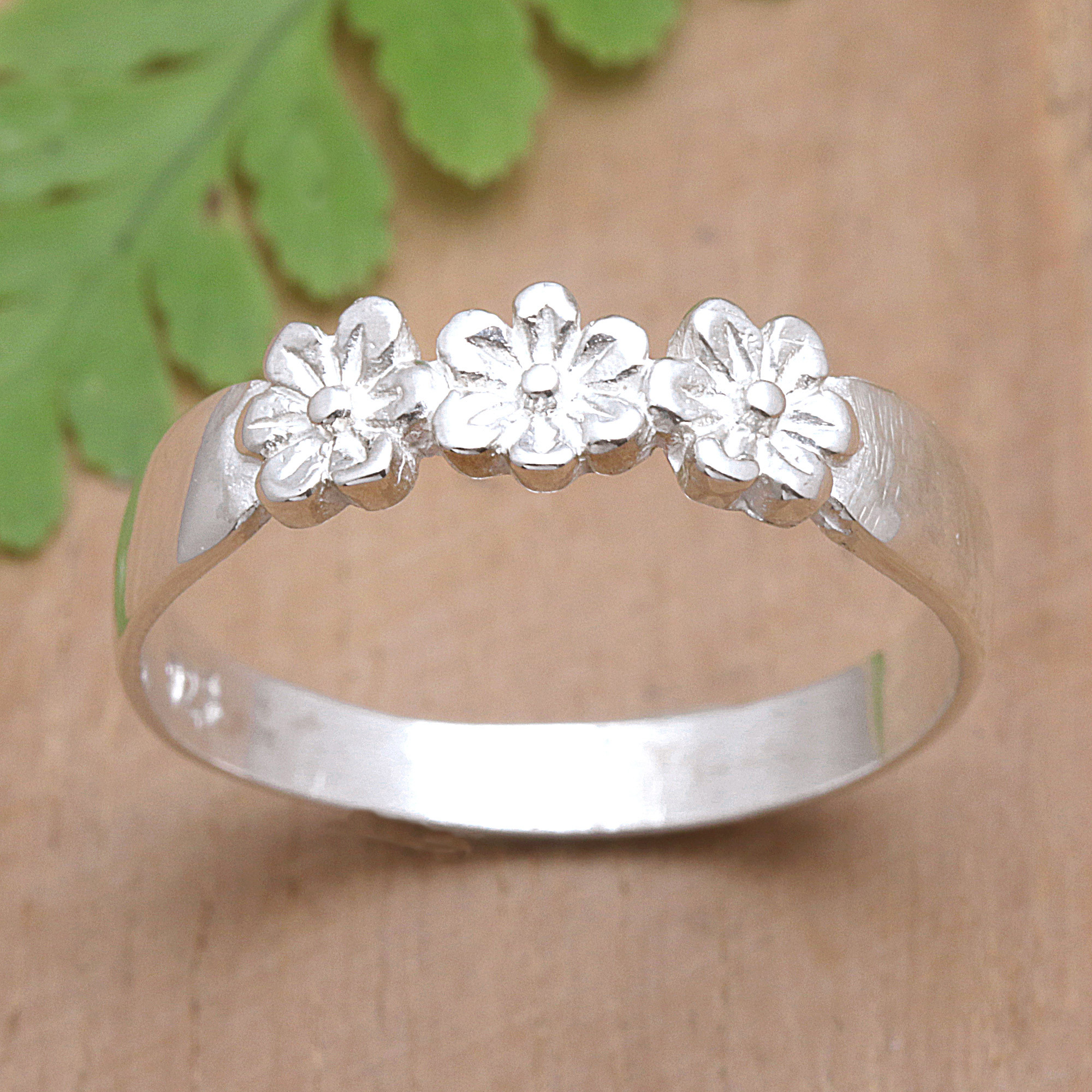 Sterling Silver Band Ring with Floral Motifs from Bali, 'Floral Trio'
