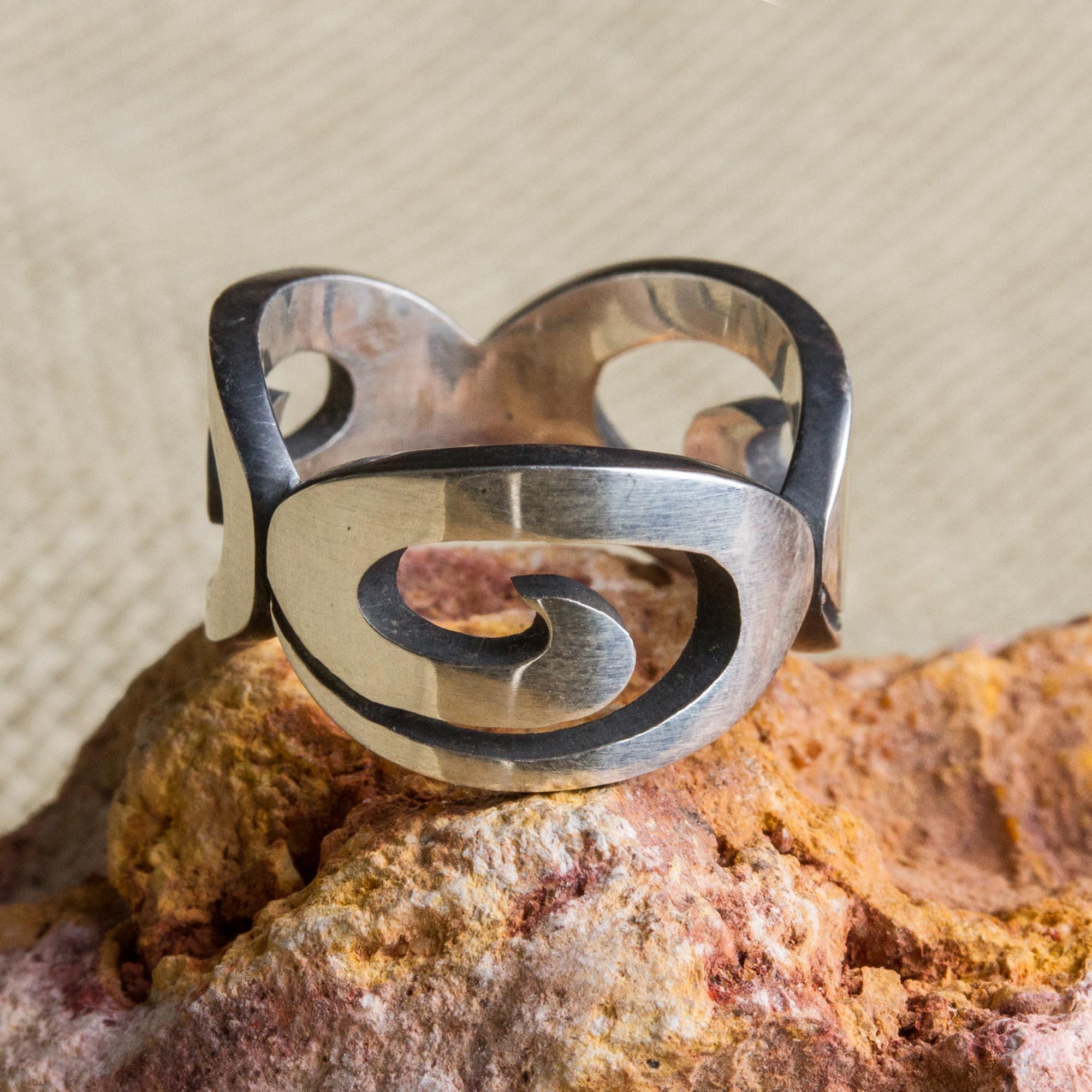 Handcrafted from sterling silver with a shining finish, this band ring is the work of Mexican artisan Angel Ortiz. He finds inspiration in Mexico's pre-Hispanic art and architecture, adapting openwork swirls to evoke flowing waves.