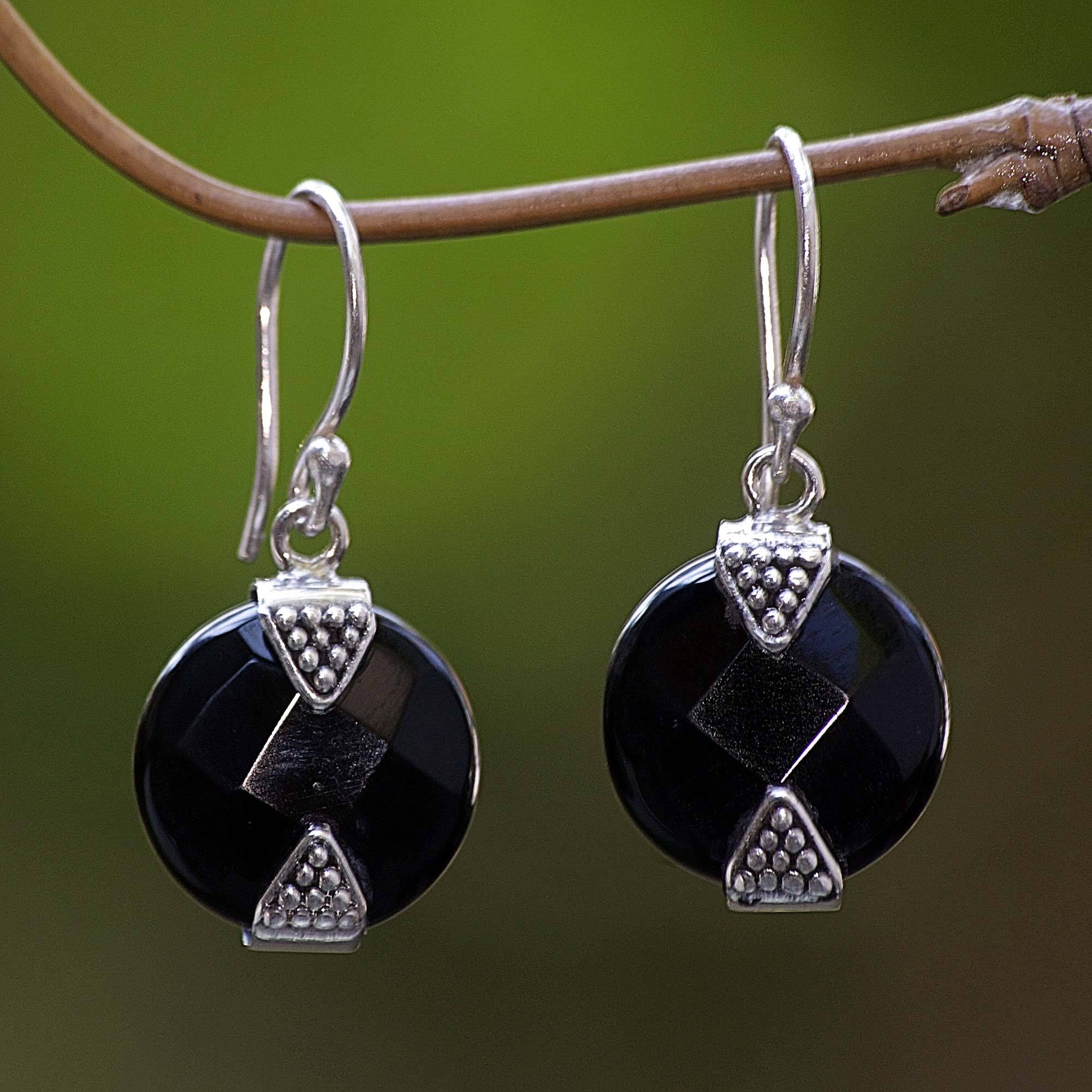 Be the center of attention when you wear these stunningly simple Black Onyx Disk earrings. Handcrafted by Sukartini, these are .925 sterling silver and black onyx dangle earrings. This unique set of beautifully crafted earrings will be an incredible addition to any jewelry collection.