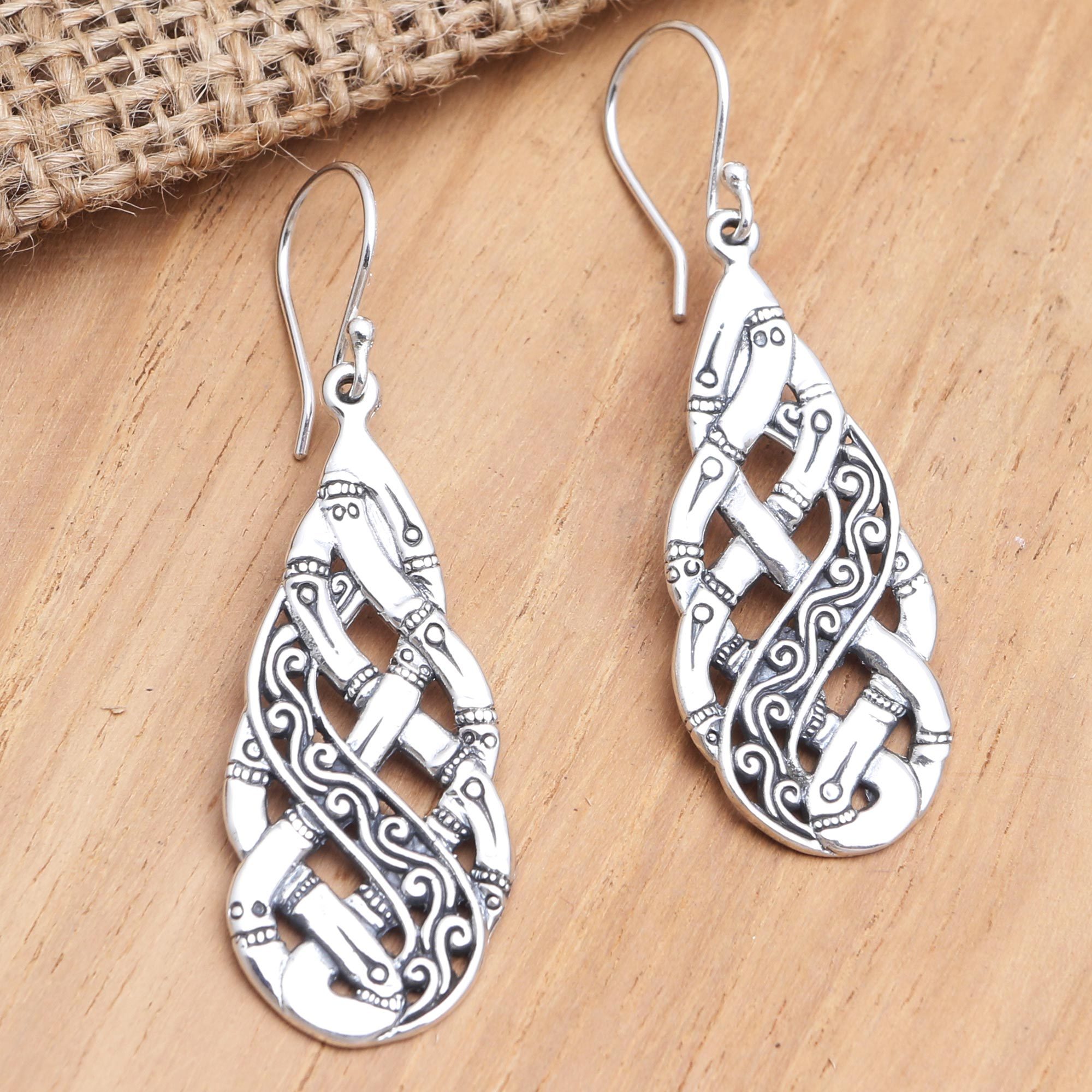 Using traditional Balinese designs, artisan Dewa Arimbawa creates a pair of elegant earrings, perfect for an evening out. Crafted from sterling silver, the earrings feature an attractive braided design and a decorative engraving that adds a charming touch.