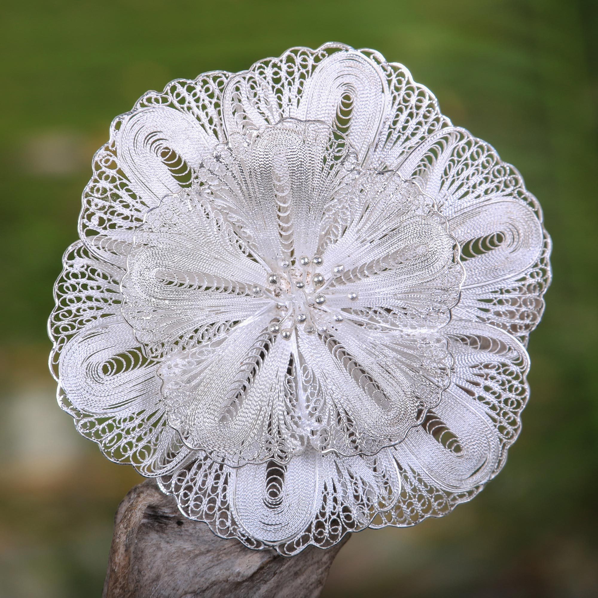 Bali's exotic frangipani flower glows with argent grace, its exotic beauty worked in sterling silver by Made Sriasih. The brooch evidences the traditional Balinese stylizations, and Sriasih presents it in a batik covered box, lined with velvet and finished with palm leaf thread. The box also features a mirror. Called Jepun in Balinese, the flower's ephemeral beauty makes this brooch a stylish complement to a sophisticated outfit.