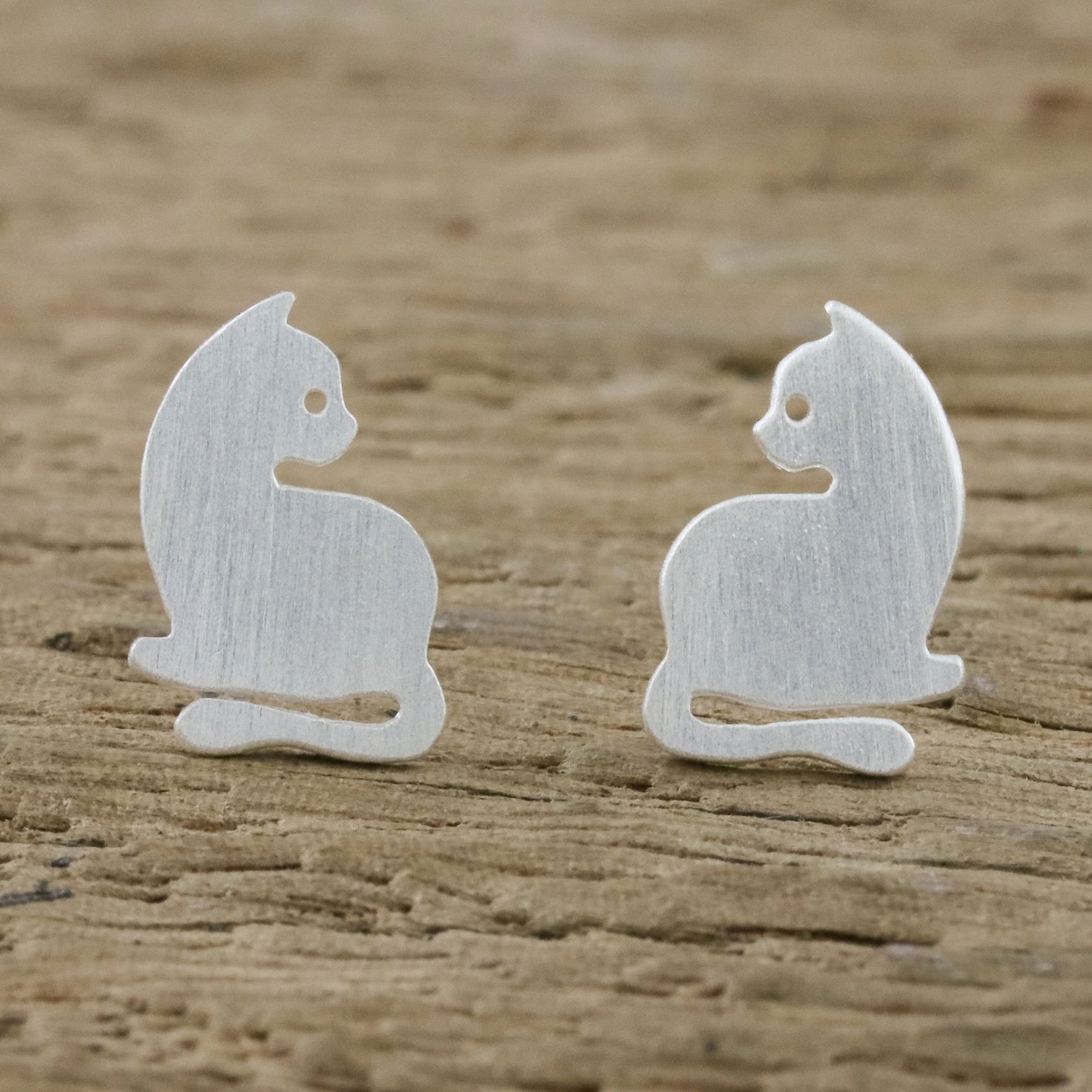 Sitting leisurely, two relaxed cats adorn the ears in this pair of stud earrings from Thailand. Jantana creates the earrings, crafting them of sterling silver with a brushed-satin finish.