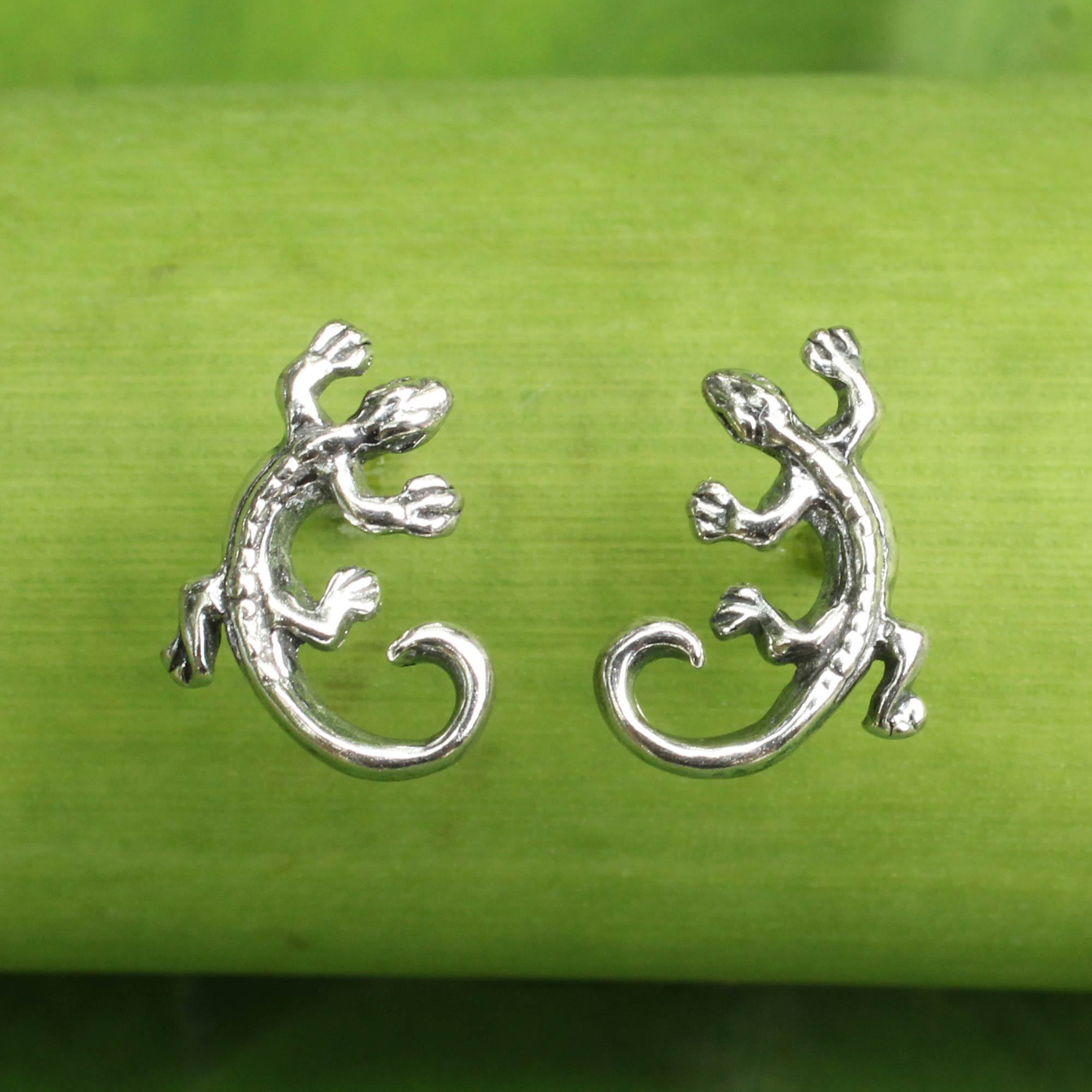 Two petite chameleons on the move are actually charming button earrings from Thai artisan Wadarat Supasirisuk. The artisan creates the earrings in gleaming sterling silver with a keen eye for detail.
