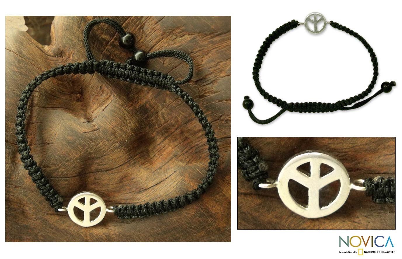 The international symbol for peace shines resplendently in a bracelet by Hema. Crafted with sterling silver, it centers a black braided bracelet that can be adjusted to the desired length.